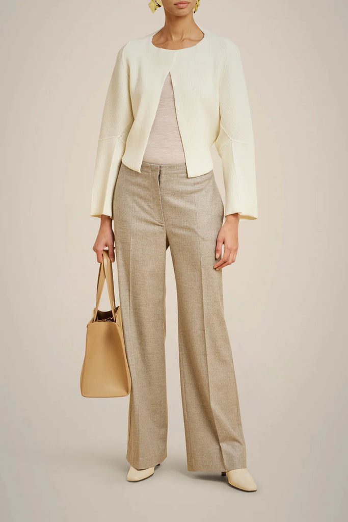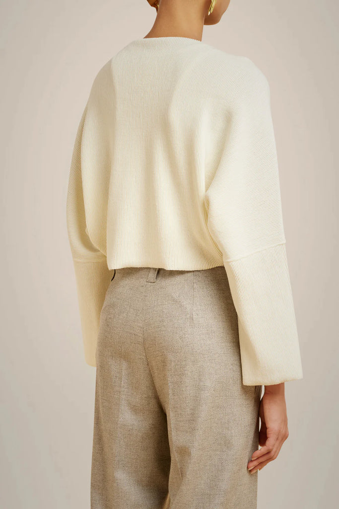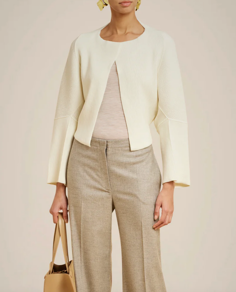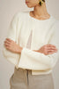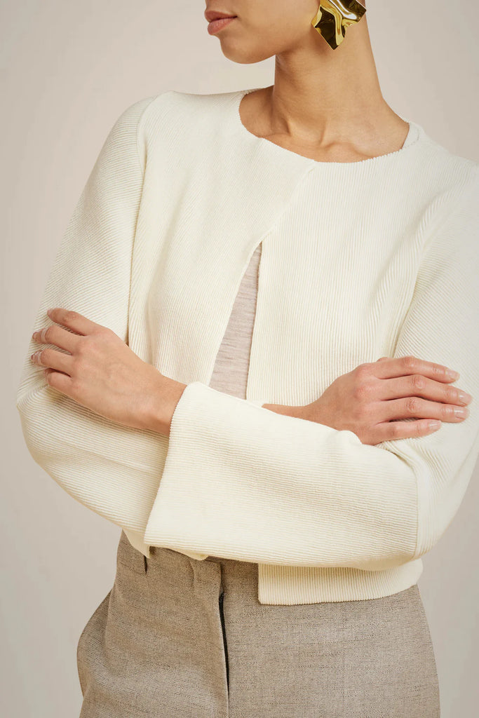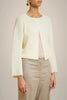 100% extra-fine merino wool crew neck cardigan, ottoman pattern, vis a vis front opening, three-quarter sleeves.