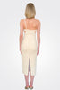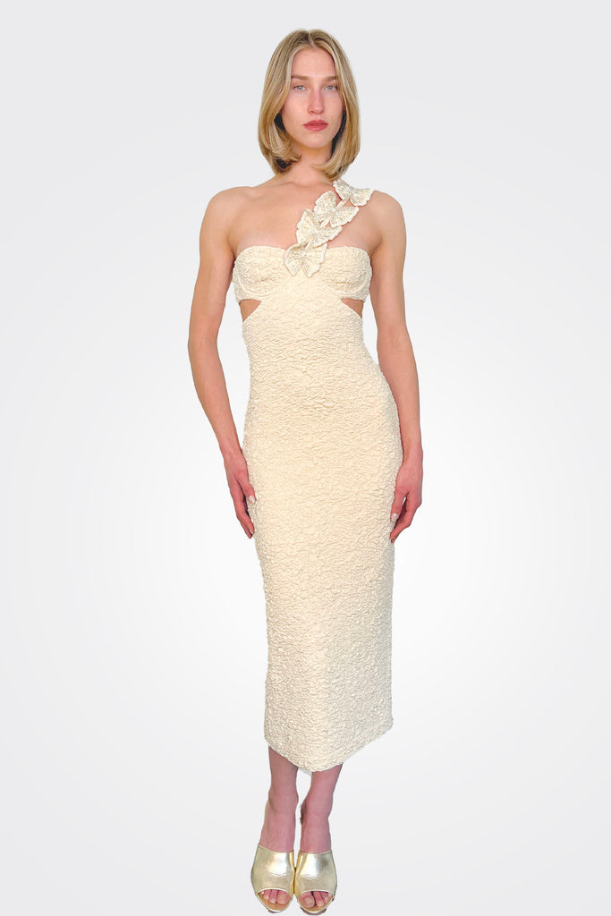 This midi dress is made of stretch jacquard fabric with hand beaded butterflies along the one shoulder neckline into the fitted bodice