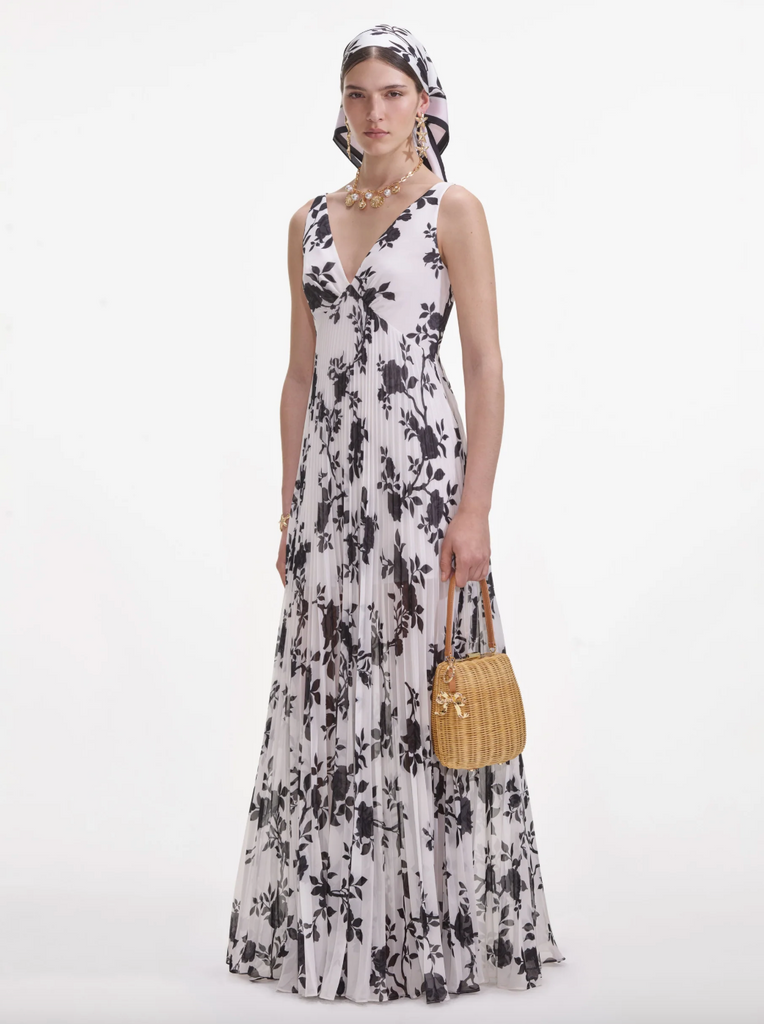Floral print chiffon gives this maxi dress a dose of summer-ready energy. Pleat detailing throughout and a flared hem skirt brings elegant motion – style with sandals for the next garden party.