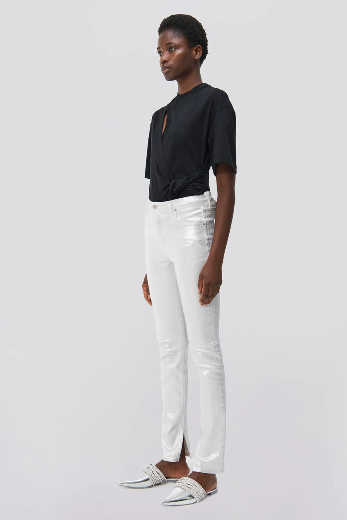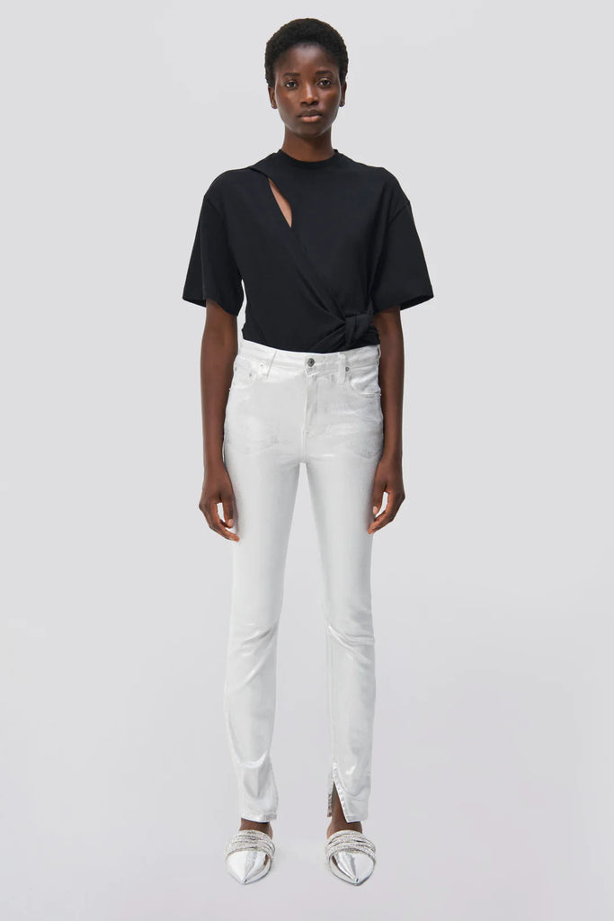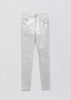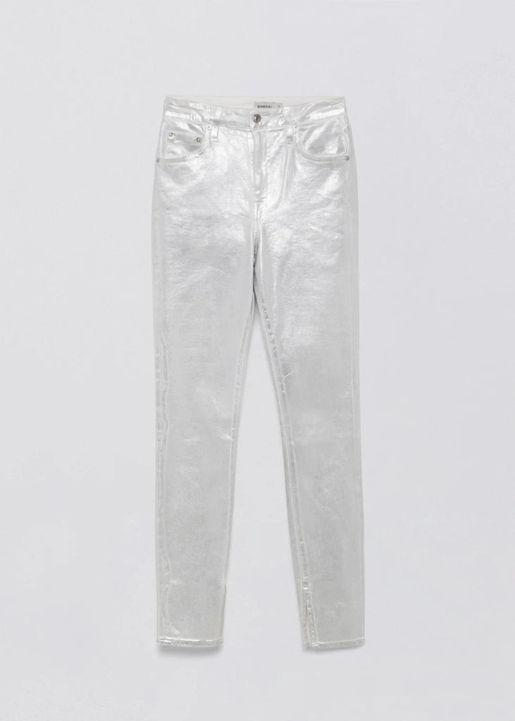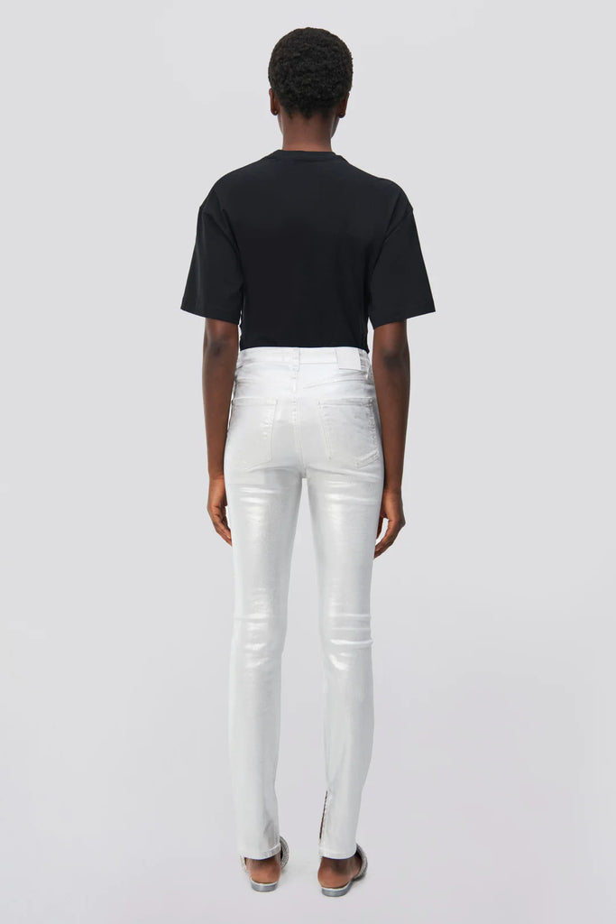 High rise, skinny leg, with a cropped ankle hem and coated blue overlay for a modern sheen.