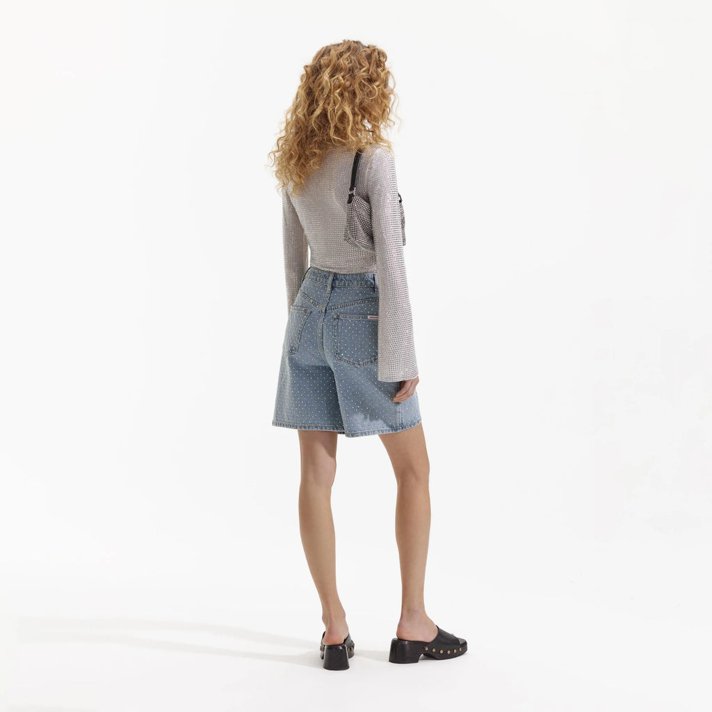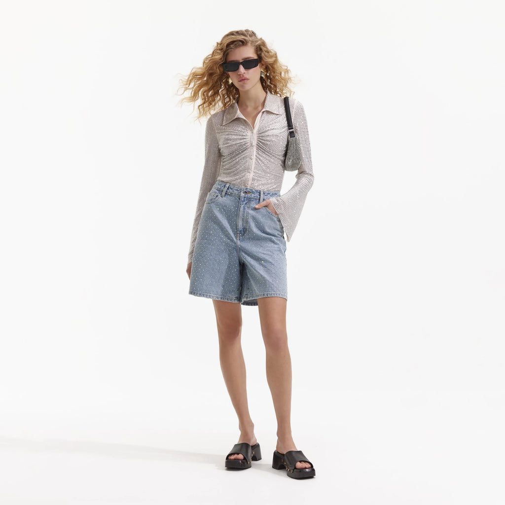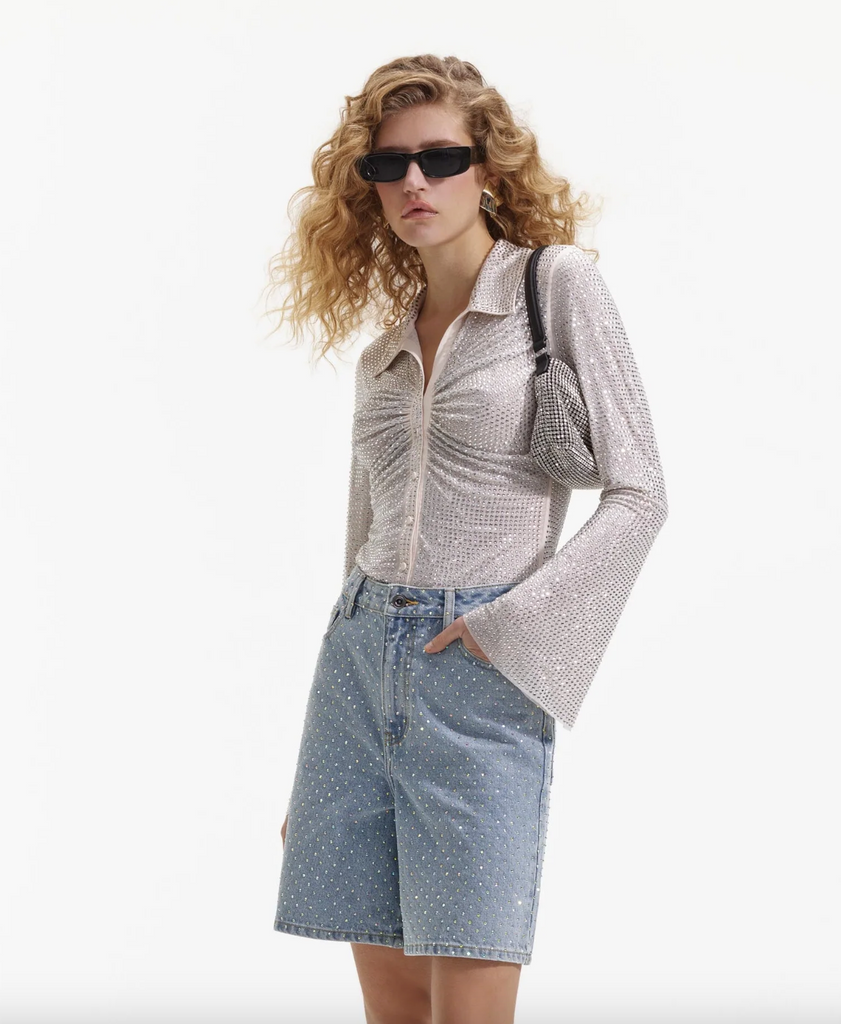 Cast in rhinestone-dotted mesh for its sultry high-shine feel, this is the ultimate going out top. A chic collar adds polish to its body-hugging fit – pair with a mini for full impact.