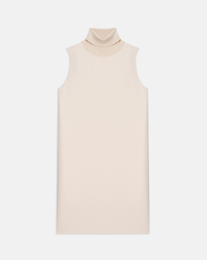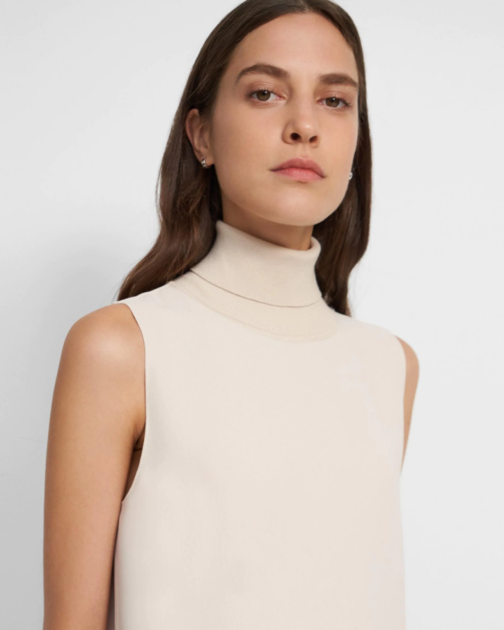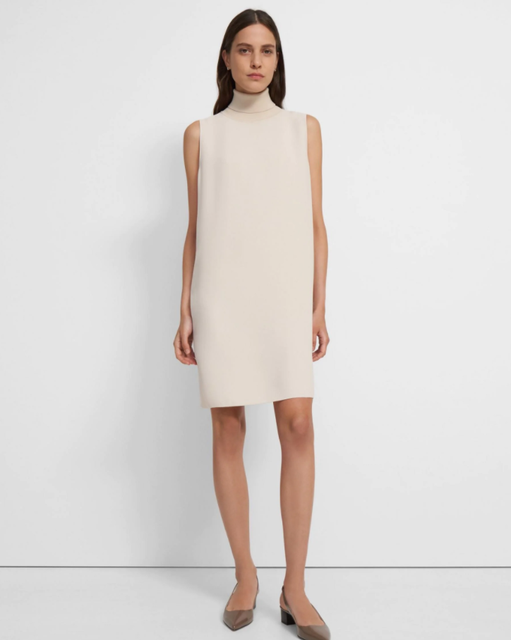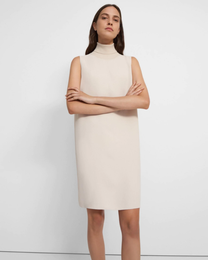 modern sheath dress in lightweight crepe with a soft drape has a relaxed fit and a contrast ribbed stretch-knit turtleneck collar. Worn with a blazer, it’s an easy alternative to the suit that moves effortlessly between work and leisure.