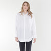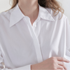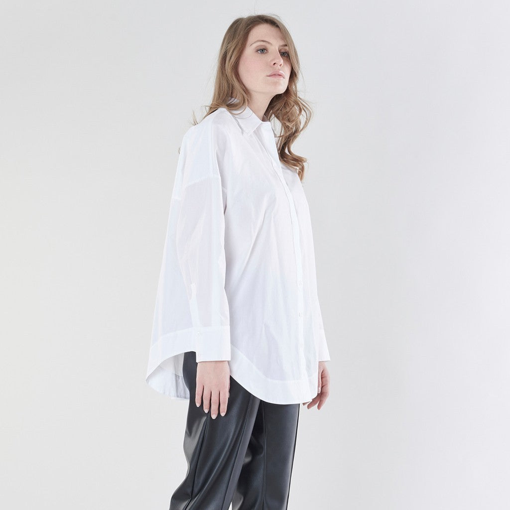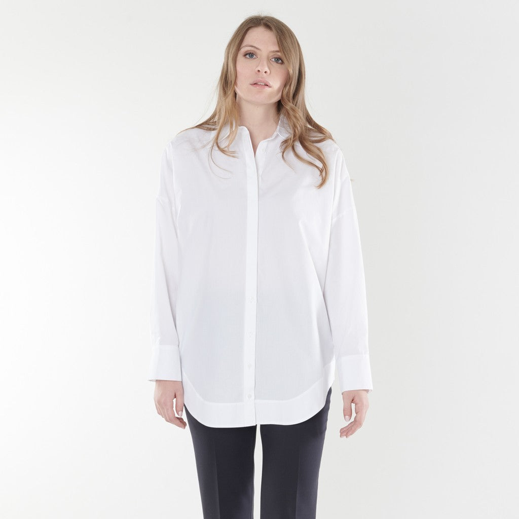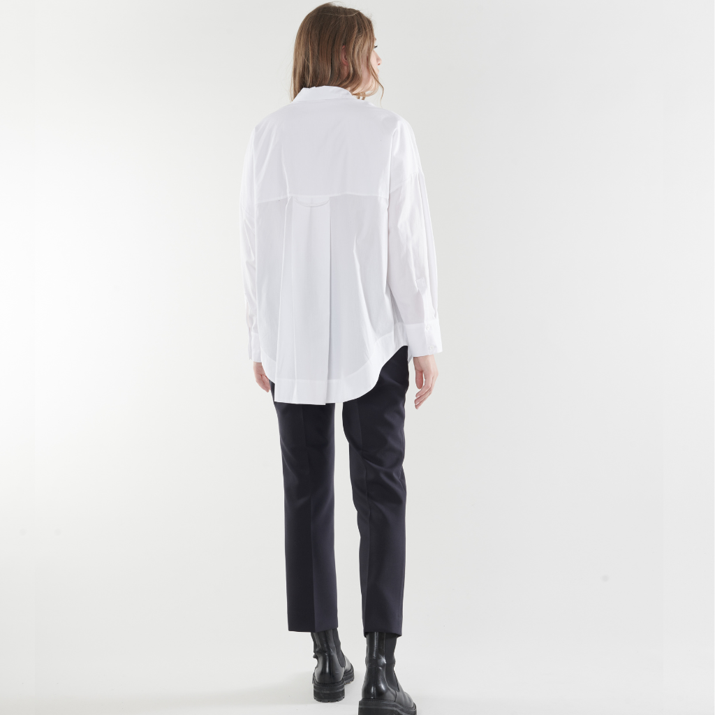 Cotton poplin shirt. Collar closed by eight natural mother-of-pearl buttons. Cutout front and back. Pleats in the back. Long sleeves, cuffs tightened by a button. Rounded base.