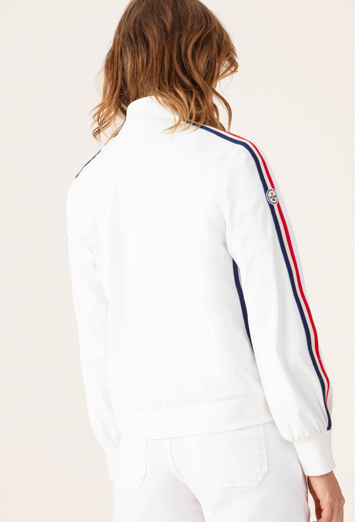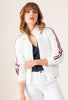 A casual and chic look is assured with the Serena jacket! This technical jersey jacket, in an immaculate white, stands out with its red, white and blue braid from the collar to the sleeves. It's both casual and elegant with a touch of whimsy.