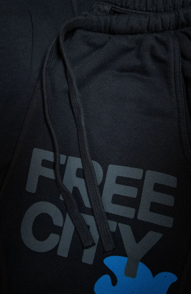 Unisex SUPERFLUFF LUX pocket sweatpant with classic "FREECITYLARGE" print with "FREECITYDOVE," covered elastic waist-band with pull drawcord, slant hip pockets and patch back pocket.