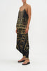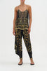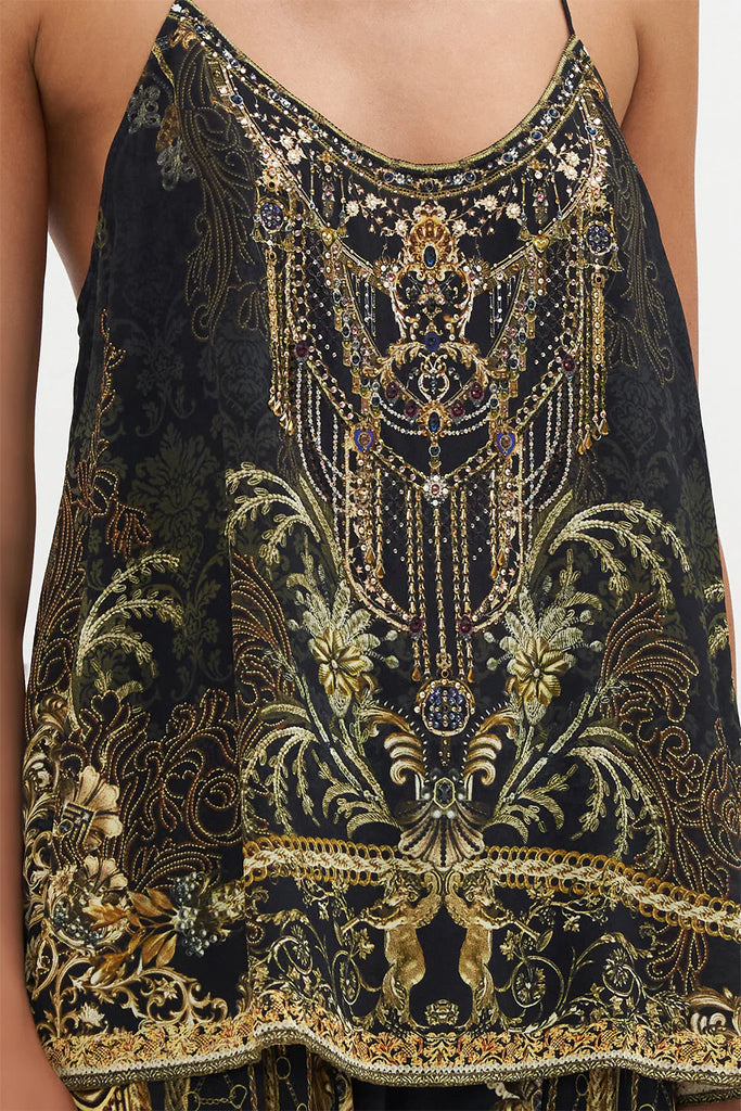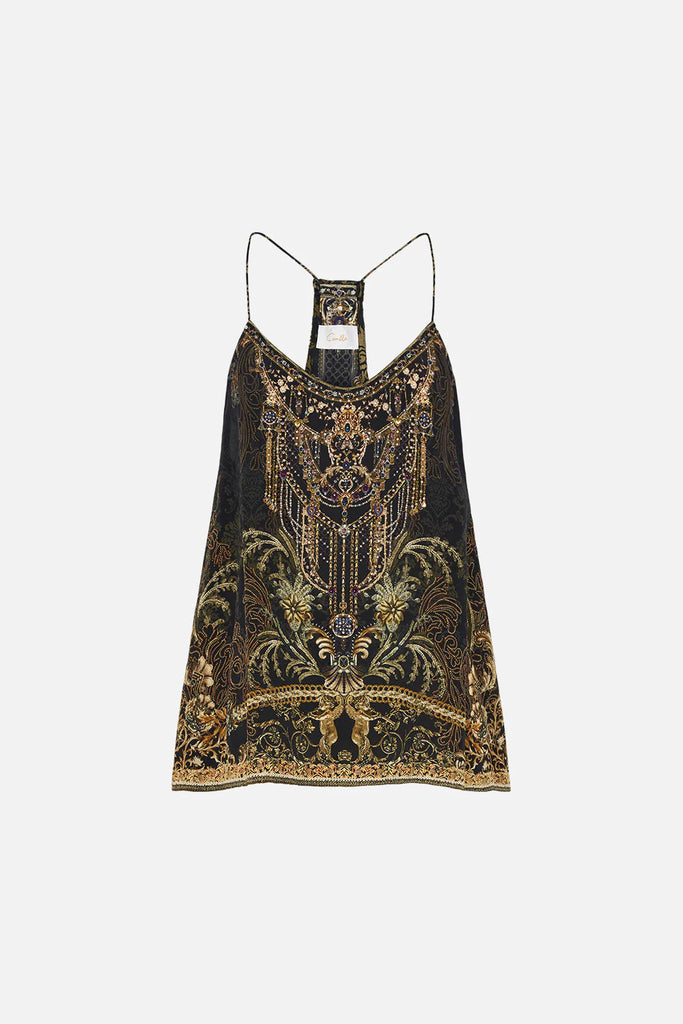 The Night is Noir T Back Shoestring Top explores a mesmorising sea of midnight hues finished with ornate golden swirls that dance alongside decadent botanical details and exquisite chain cascades. Adorned with hand-embellished CAMILLA crystals, this statement silk camisole plays host to intricate back detailing, a shaped flared hemline that falls into a timelessly relaxed silhouette and dainty shoestring straps.