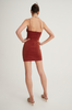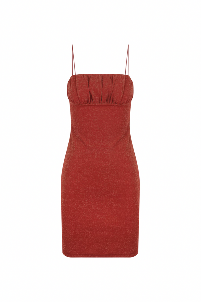 A fitted mini, this dress is constructed in a Amber hued Metallic Stretch. Paneling through the body creating fit, elevated by a bust panel with gathering underneath bust. Slim elasticated straps and opening via an invisible zipper at the center back of the dress.