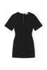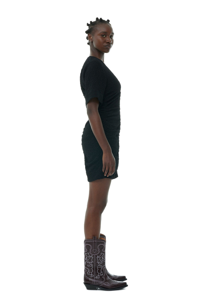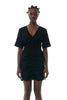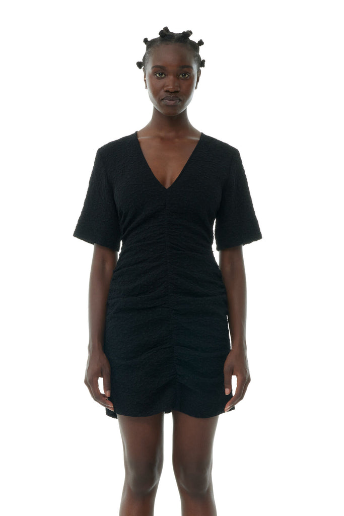 This Black Textured Suiting Mini Dress is designed for a slim fit and features a V-neckline, elbow-length sleeves, zip closure at the back and ruching at the front, sides and back.