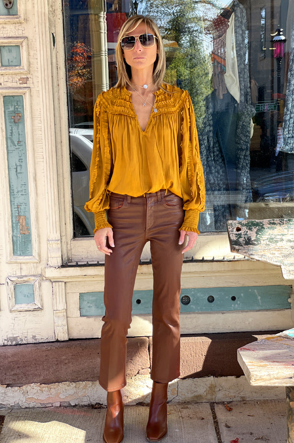 The Callie in 'Cinnamon' is a high-rise cropped bootcut jean that’s been garment-dyed to rust, coated and pressed for a chic finish. The five-pocket pair comes in Vintage Stretch denim that has a slightly heftier weight and authentic weave texture.