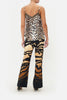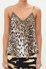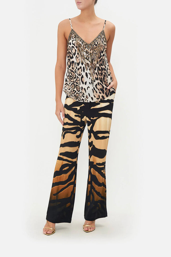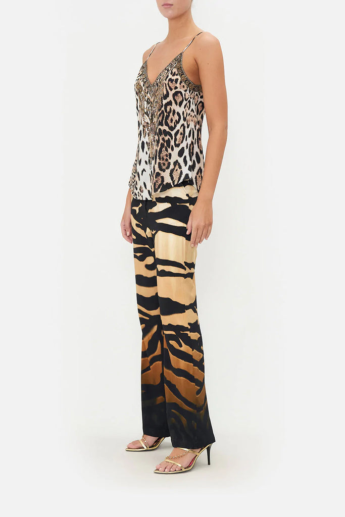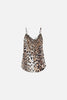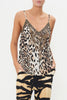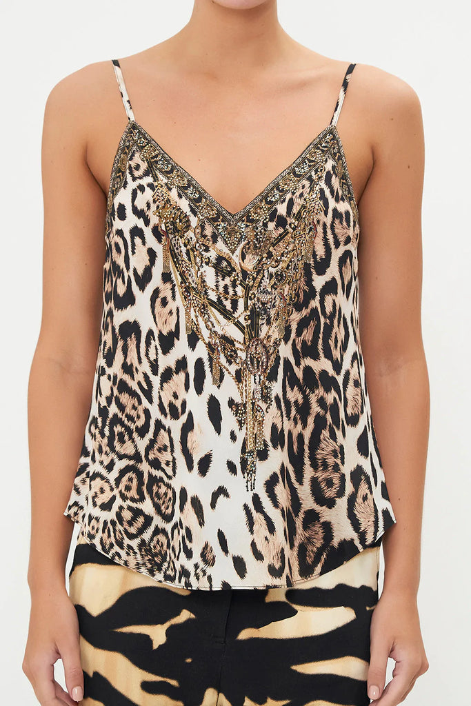 The Cool For Cats V-Neck Bias Cami captivates our gaze with timeless leopard print wrapped in sensational hues of ivory and mocha alongside eclipsing moments of midnight and golden chain accents. Adorning hand-embellished CAMILLA crystals, this luxury silk camisole plays host to a soft v neckline, a relaxed bodice that leads into a flared hemline, an on-the-bias silhouette, low back detailing and customizable straps.