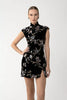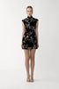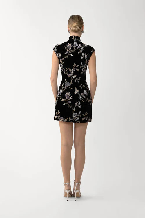 The Devon Velvet Dress is a cheongsam-inspired silhouette crafted from silk velvet adorned with tonal embroidered florals.
