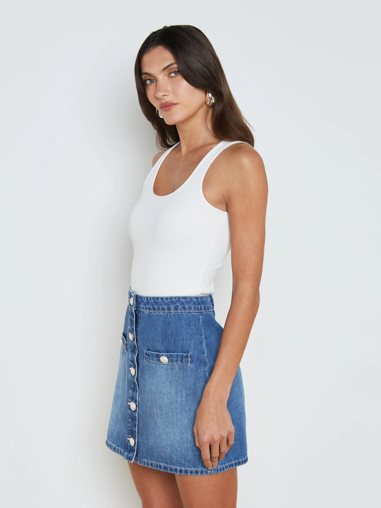The essential white tank, perfected. Our Adira strikes an elegant modern tone with a sultry deep scoopneck and slim fit, now in the color trend of the season. • Soft ribbed knit• Slim fit• Deep scoopneck