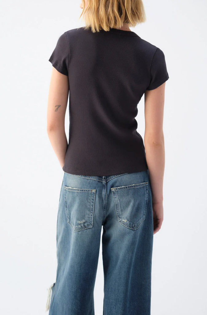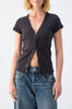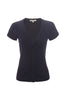 A modern and feminine ribbed button-up with a slim fit and classic V-neckline.