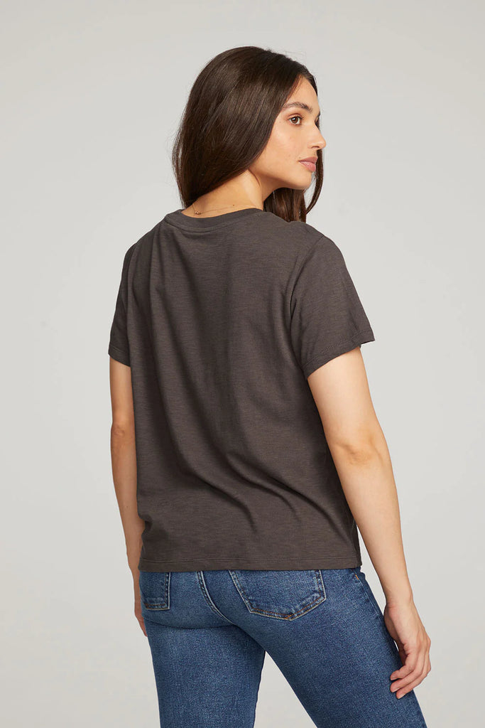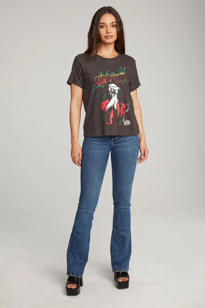 "Everything is gonna be alright" in this Bob Marley Live On Stage women's short-sleeved tee in vintage black. More than 40 years after his death, Bob Marely's laid-back and feel-good vibes continue to leave an everlasting impression in music, as do his classic songs that are filled with positive messages of unity, hope, and peace.