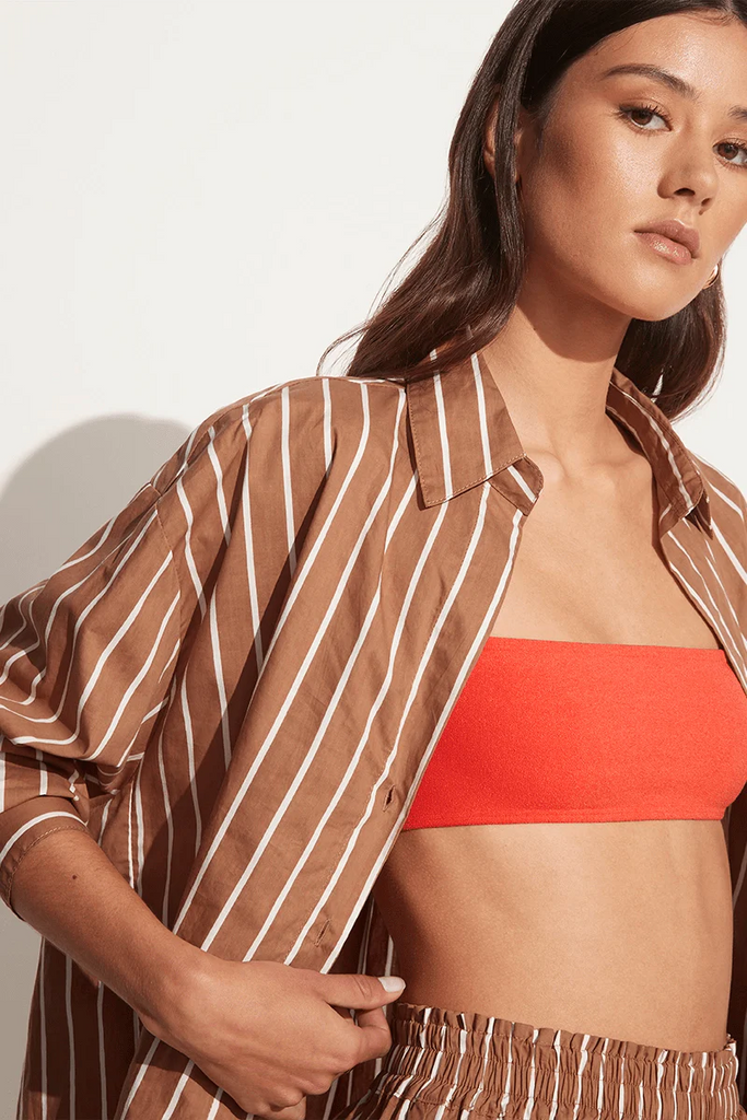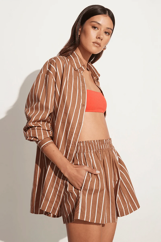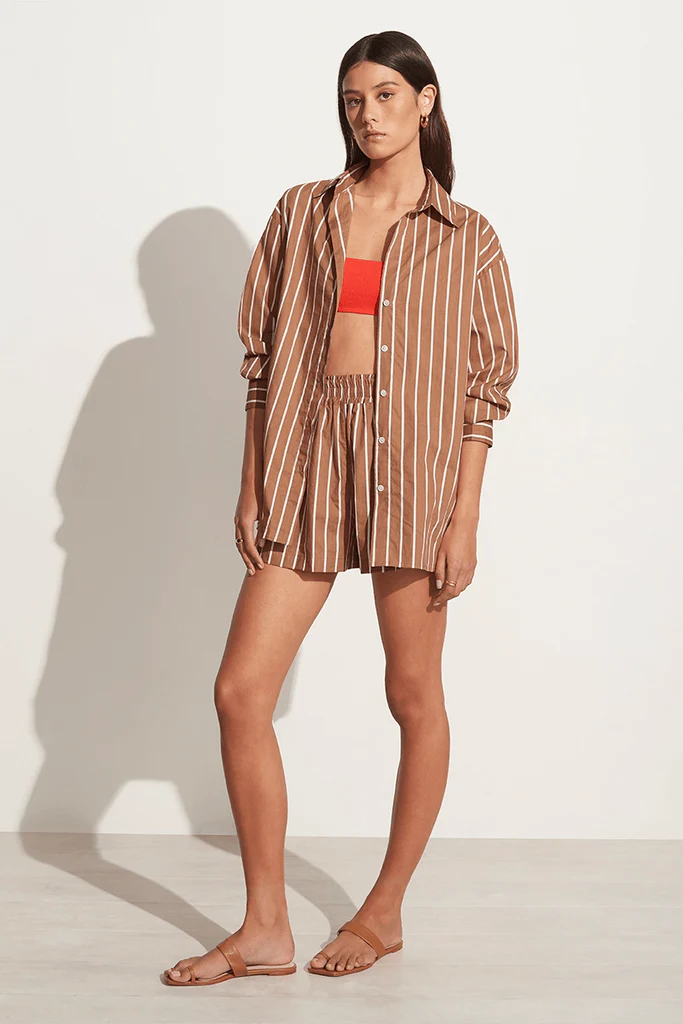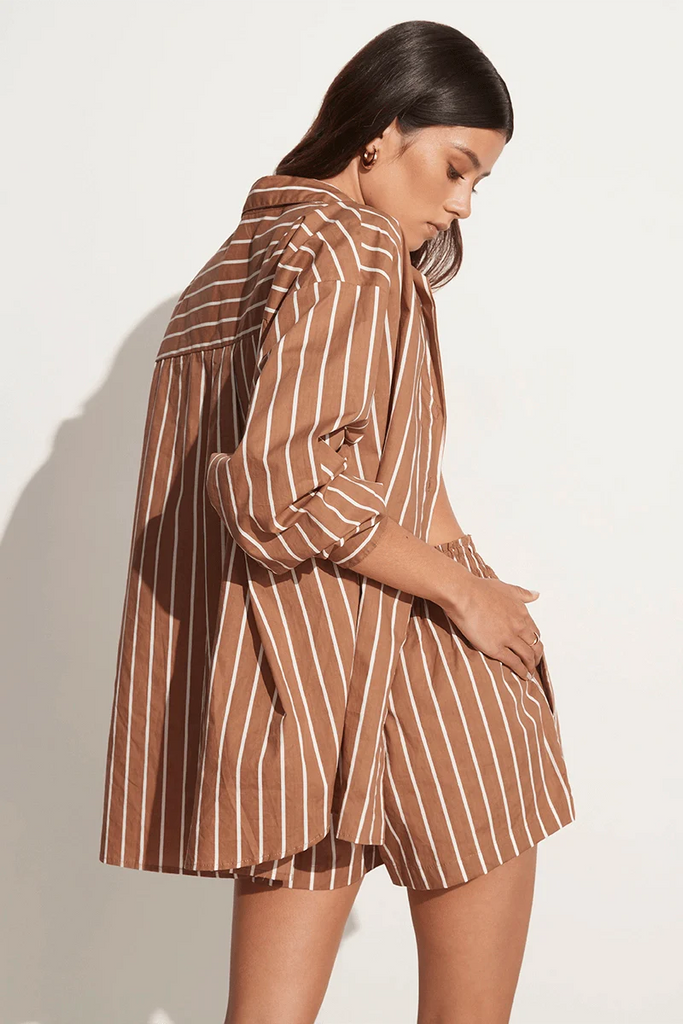 The Daija Shirt is a striped button up shirt consciously cut from certified organic cotton poplin, artisanally hand-printed in Adia Stripe Print Hazelnut. An oversized silhouette defined with a collared neck and button detailing on the front and cuffs, the Daija is an easy-wearing essential you'll gravitate towards all year around.