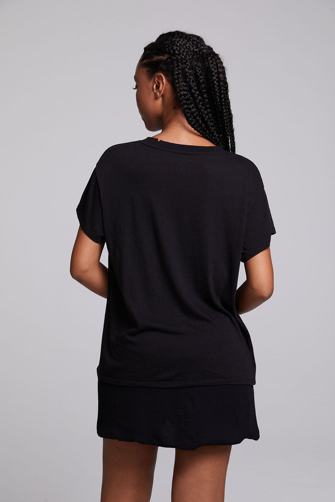 Pair it with jeans for a laid-back yet chic look, or dress it up with a blazer and heels for a night out. Keep it at the front of your closet, as black goes with everything and this tee is a true wardrobe staple.