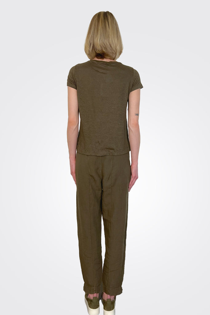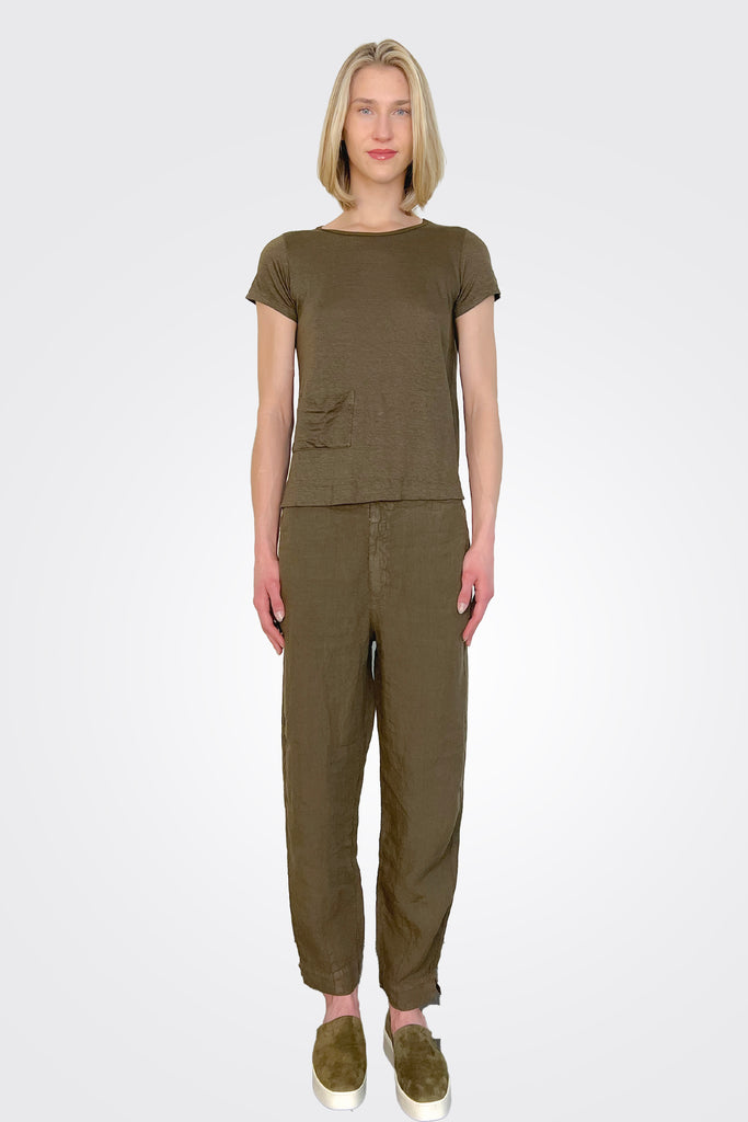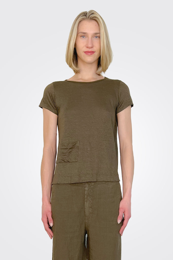 This slim-fitting white tee features a pocket front made of soft linen fabric.