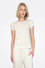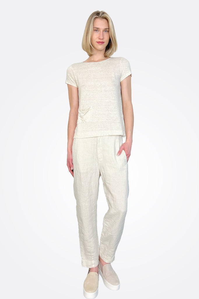 This slim-fitting white tee features a pocket front made of soft linen fabric.