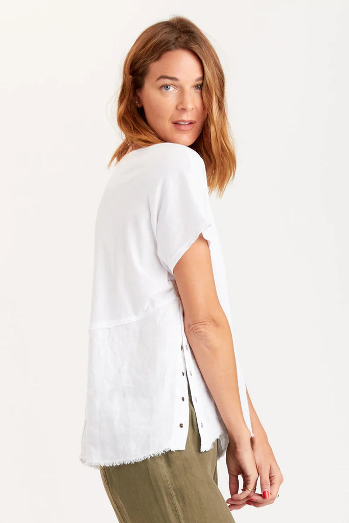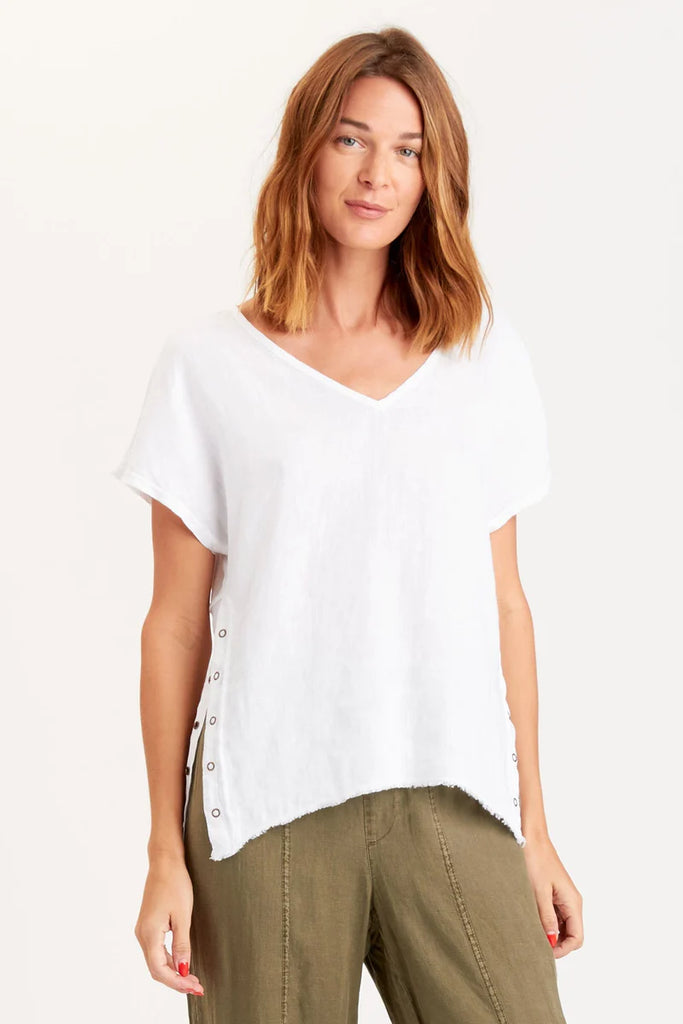 A simple shell top with a twist, or rather, a snap! Snap up side seams allow for you to rock Rian snapped up or free flowing. Contrasting jersey panel on the back yoke gives Rian extra easy breezy vibes.