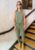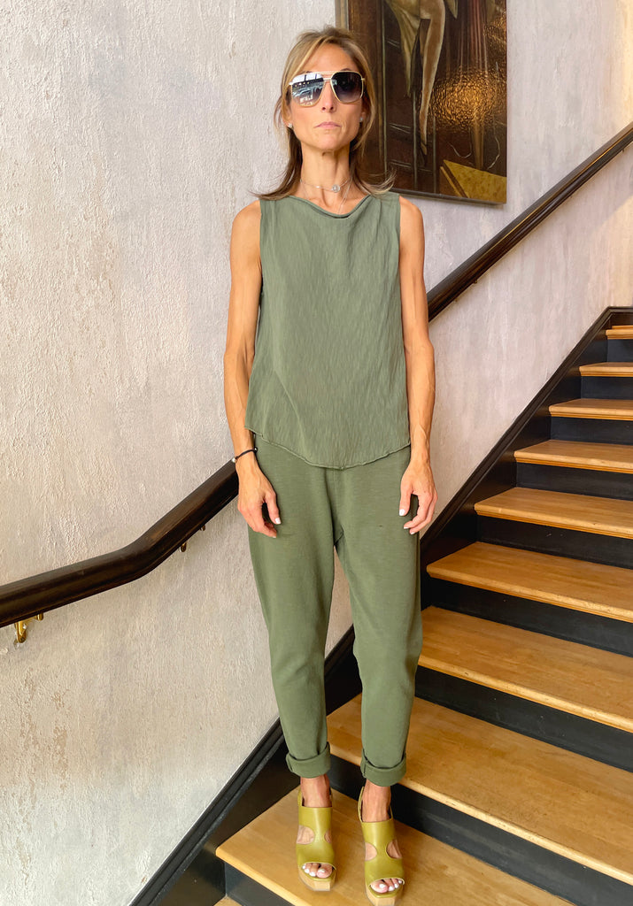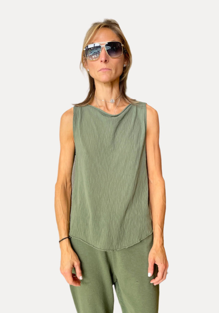 Light knitted vest made of barré cotton and polyamide with a shot effect. Garment dyed.