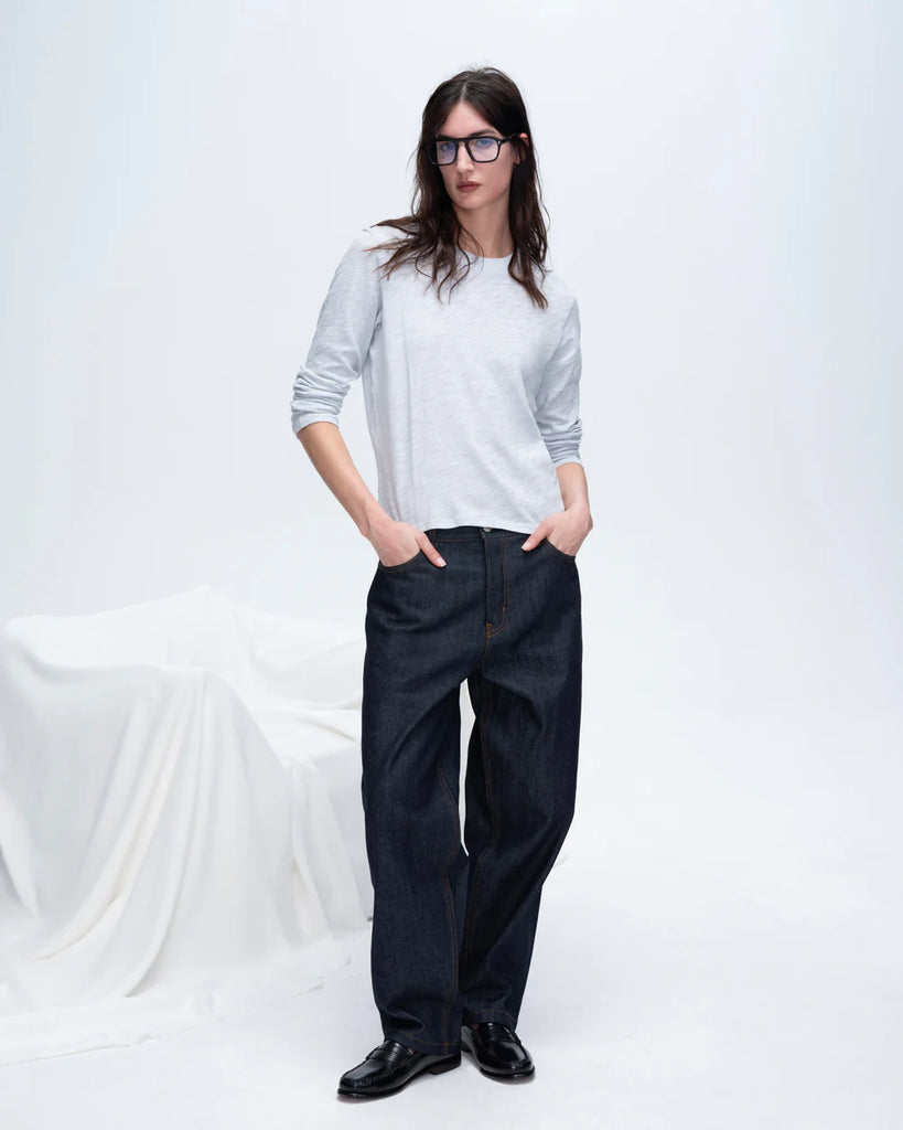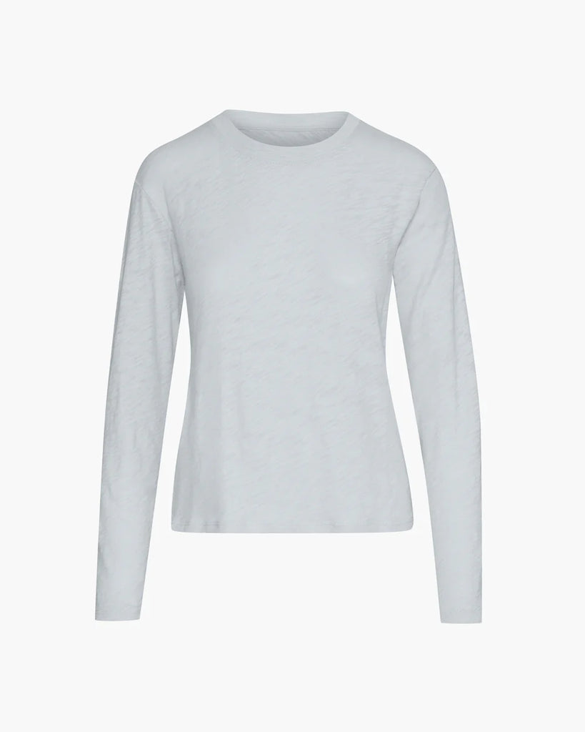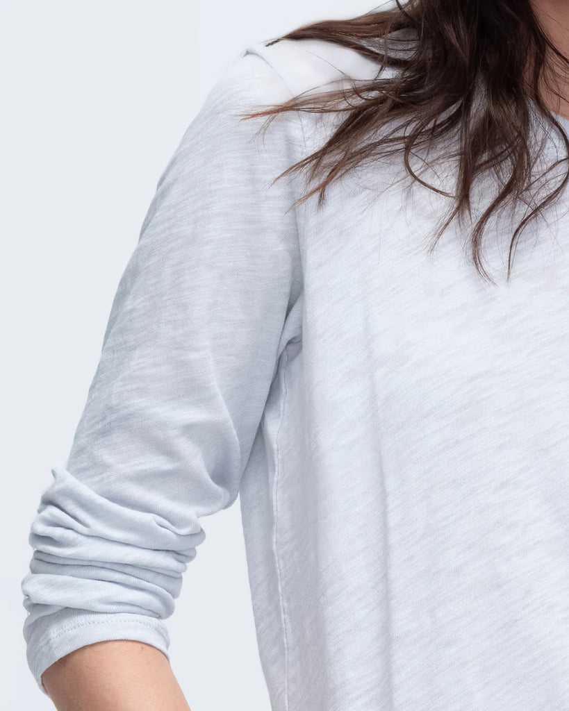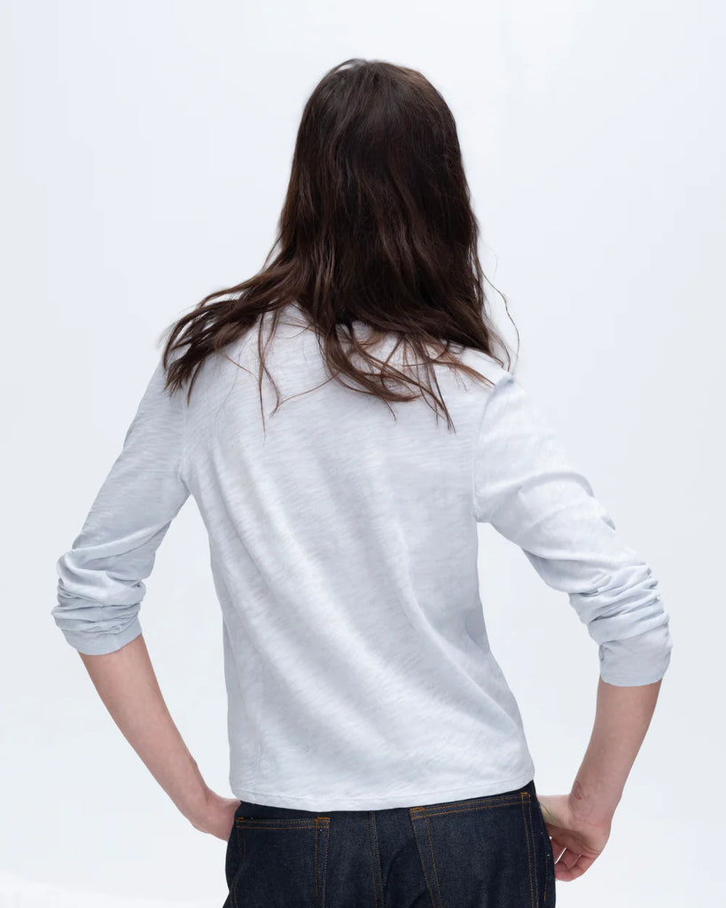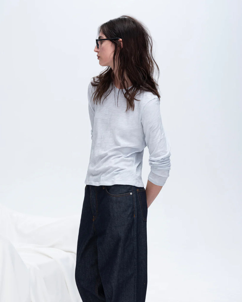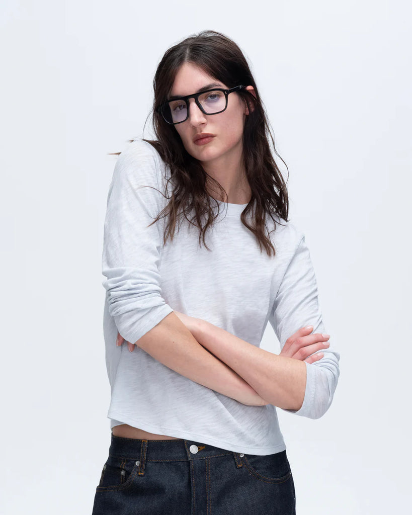 The Slub Jersey with Chroma Wash Long Sleeve Crop Tee gets its texture from the uneven yarns of our unique Peruvian Cotton. It features a treatment that uses recycled bottle caps to remove dye and give each tee its unique look.