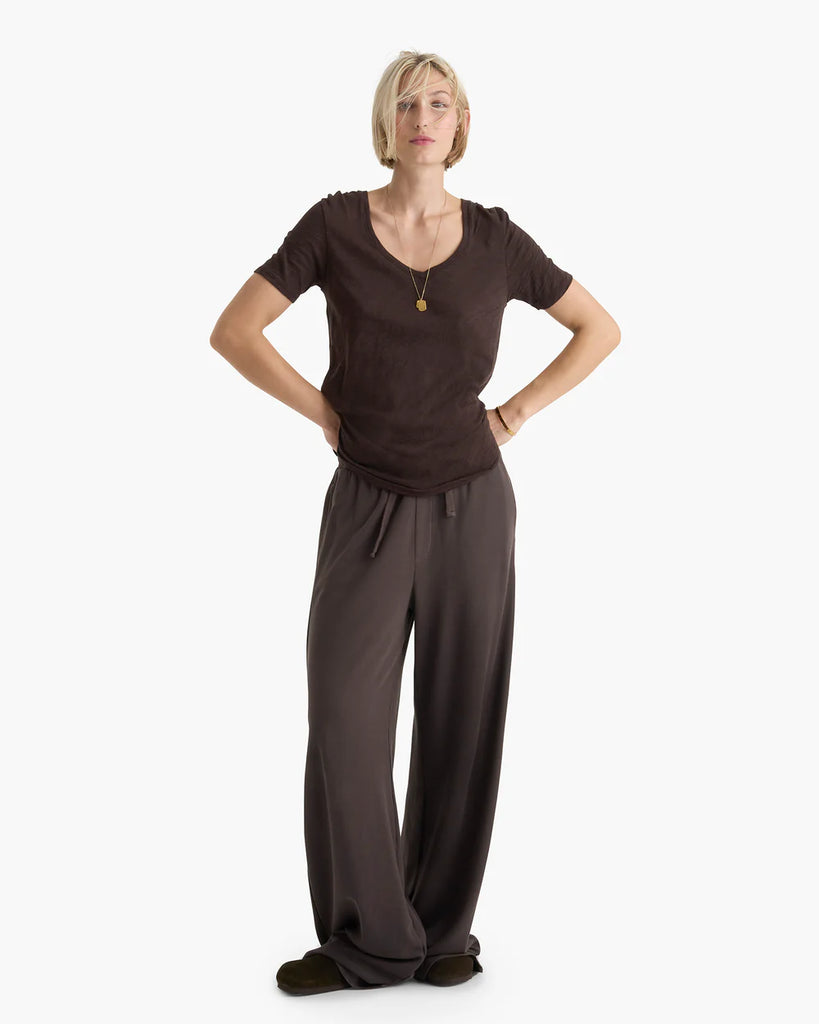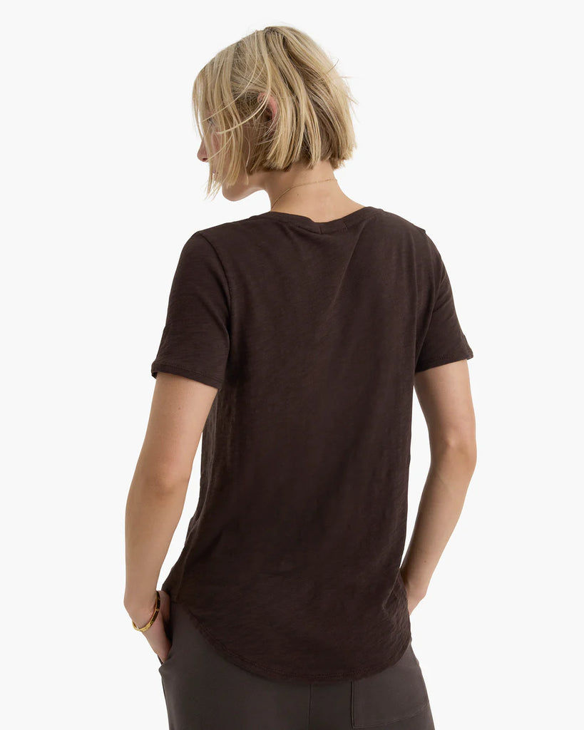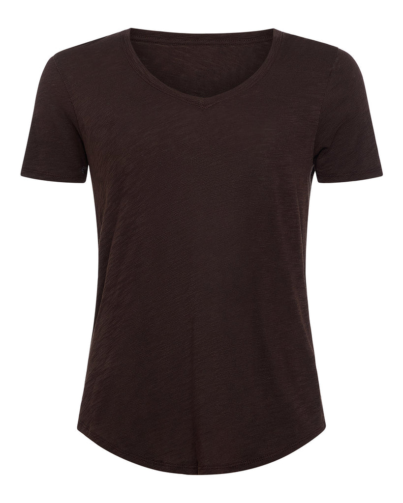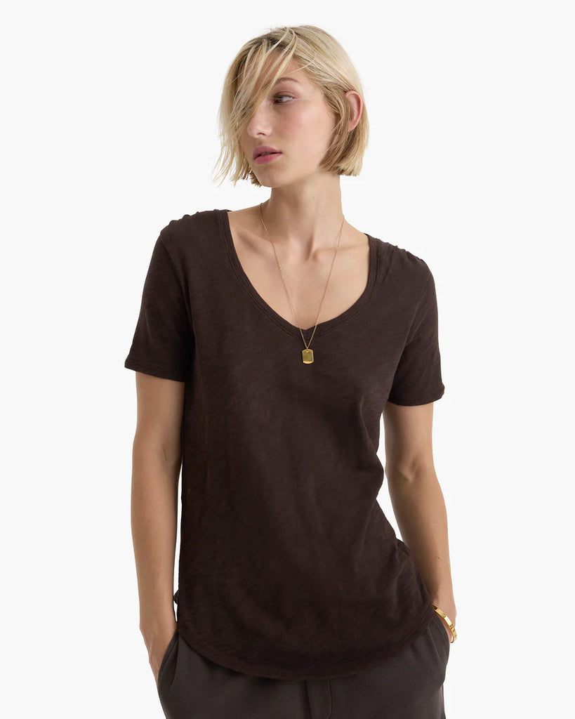 The Slub Jersey Classic V-Neck Tee gets its texture from the uneven yarns of our unique Peruvian Cotton. It features a relaxed v-neck, shirred shoulders and just the right amount of sheer. The loose weave of this heavier Cotton molds modestly to the body offering the perfect drape. Its long, flattering silhouette is meticulously measured--tapered at the bust with a shirttail that covers the butt without cling.