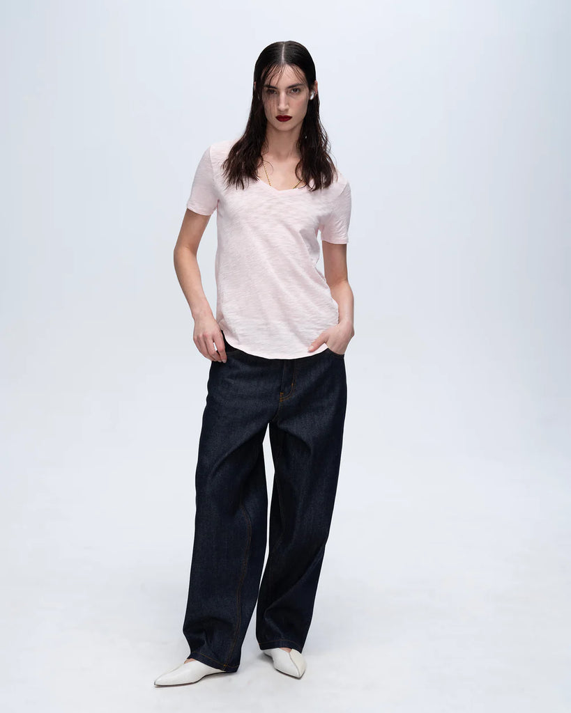 The Slub Jersey Classic V-Neck Tee gets its texture from the uneven yarns of our unique Peruvian Cotton. It features a relaxed v-neck, shirred shoulders and just the right amount of sheer. The loose weave of this heavier Cotton molds modestly to the body offering the perfect drape. Its long, flattering silhouette is meticulously measured--tapered at the bust with a shirttail that covers the butt without cling.