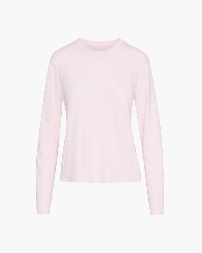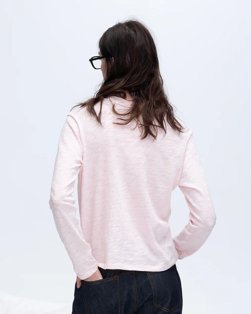 The Slub Jersey Long Sleeve Crop Tee is lightweight and breathable, delivering a soft, airy feel. Made in Peru from 100% Cotton, it features long sleeves with sleeve cuffs, a relaxed crew neck silhouette, and a subtle sheer finish for a modern, effortless look. The loose weave of this heavier cotton gently conforms to the body, creating a naturally flattering drape.