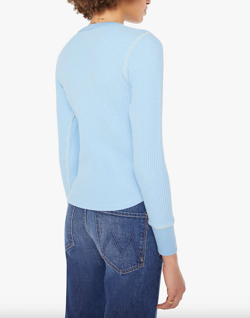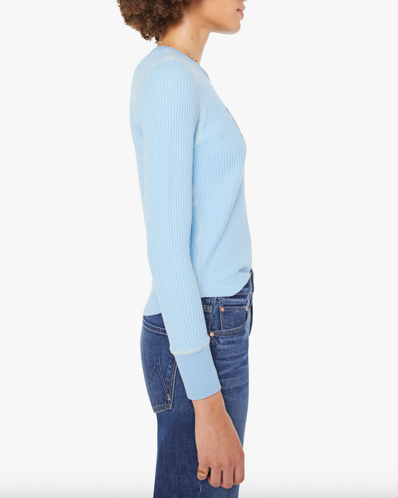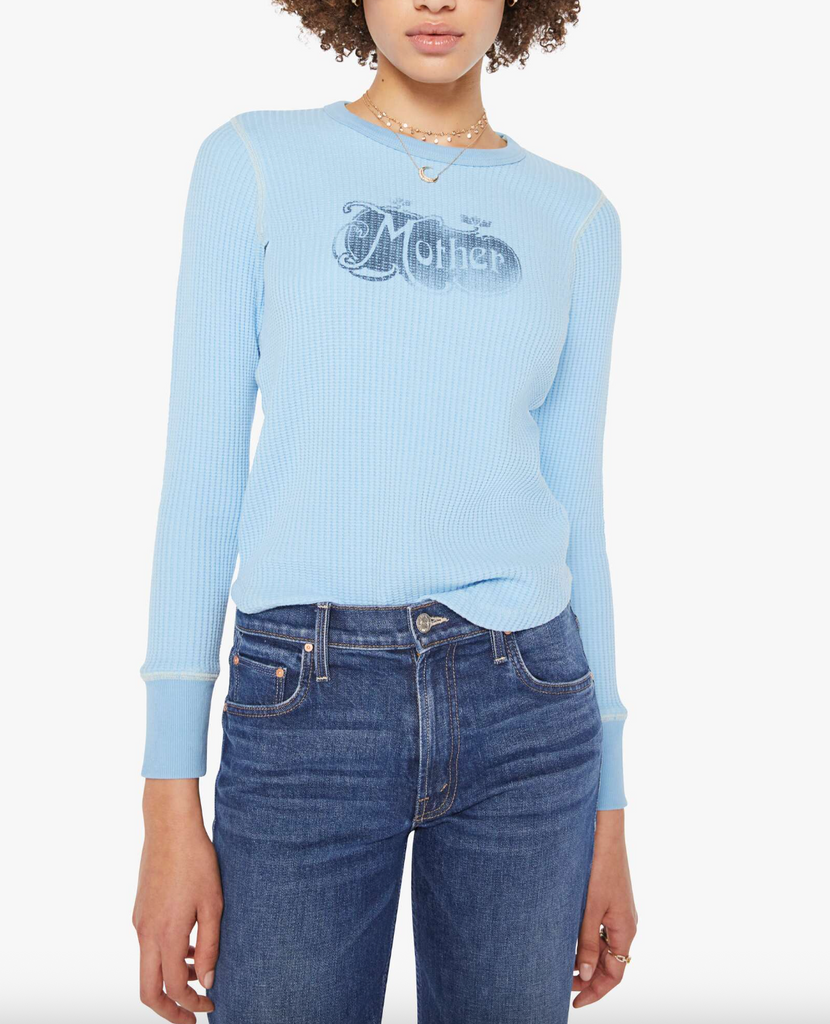 A slightly shrunken long-sleeve thermal with a crewneck and narrow fit. Made from stretch cotton, the top is designed in baby blue with a faded navy graphic on the front.