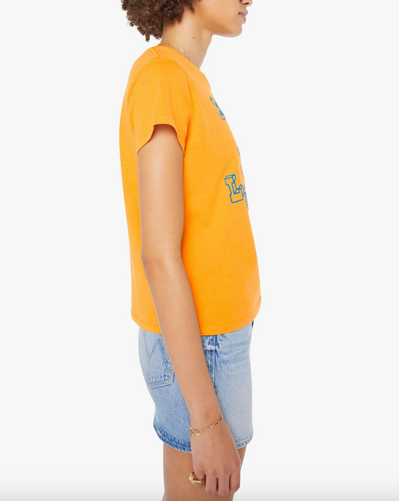 Fair warning. The Lil Goodie Goodie in Baby I'm A Loser is a soft, slightly sheer crewneck with a slim fit for a vintage look and feel. Made from 100% cotton, the bright orange tee features block text in blue on the front.