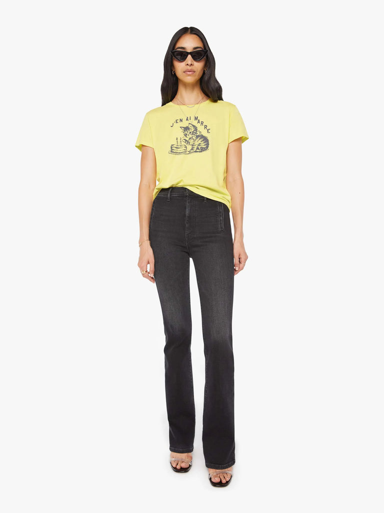 Ce n'est pas de la tarte. The Lil Goodie Goodie in I'm Over It is a soft, slightly sheer crewneck with a slim fit for a vintage look and feel. Made from 100% supima cotton, the pale yellow tee features a kitten graphic and text in French on the front.