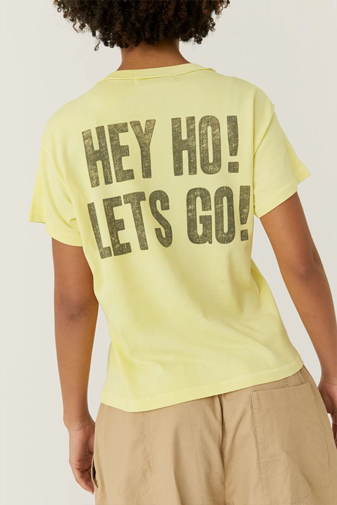 Let’s go…crank up your collection in this high energy, sun faded citron girlfriend tee featuring everyone’s favorite lyrics on the back. The club was CBGB, the street was Bowery & Bleeker, the band was The Ramones. A nod to where they first publicly debuted and quickly rocketed to star status, this new girlfriend tee is marked with New York City’s CBGB’s location and The Ramones’ crest. Fun fact, Bowery & Bleeker soon became home to a tribute mural of the icons painted by the fans.