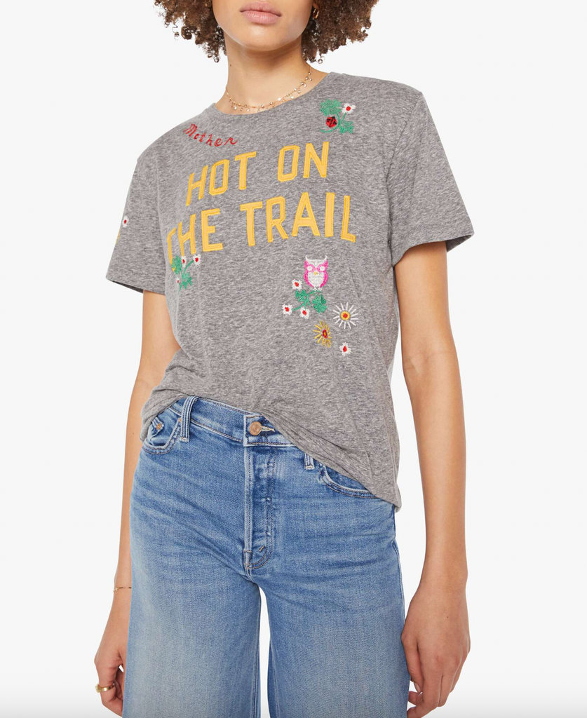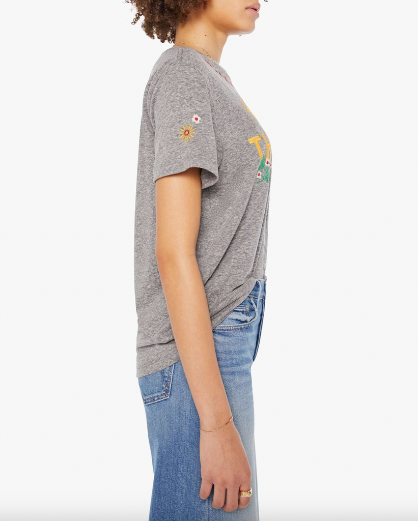 Run don't walk. A crewneck tee with an oversized fit and a clean hem. Made from a cotton blend, the heathered grey tee features yellow block text on the front and colorful embroidery throughout.
