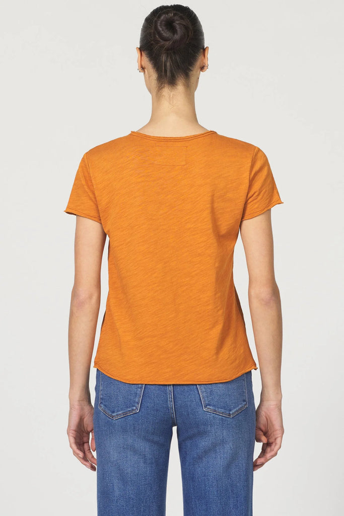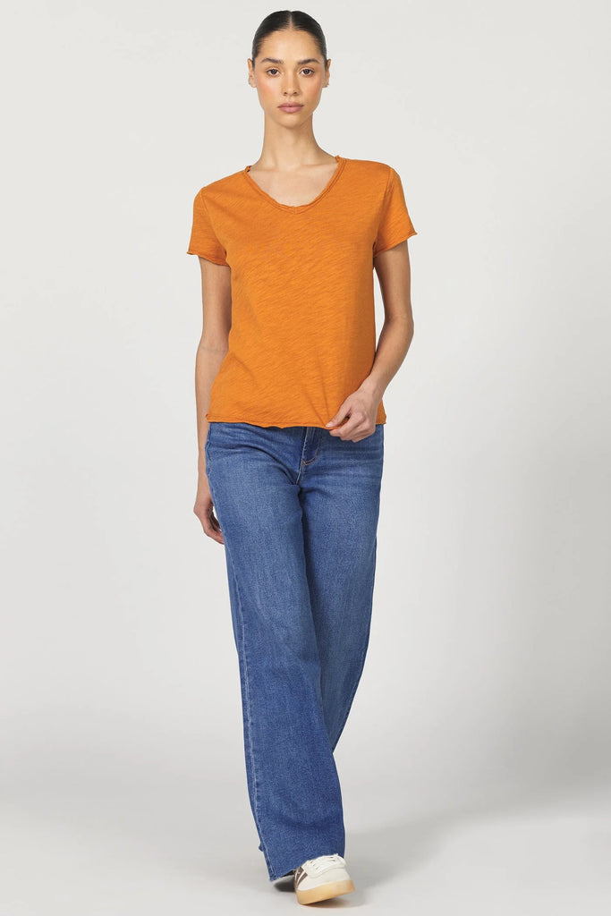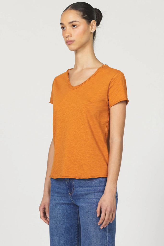 Short sleeve slub tee, v-neck with raw edges & patch labeling. The trendy piece that radiates your flair in soft & texture fabric, with a vintage wash touch... Solid color knit on relaxed fit.