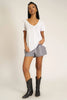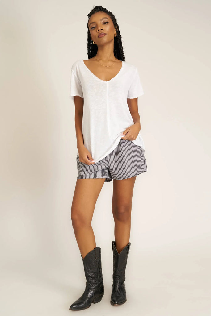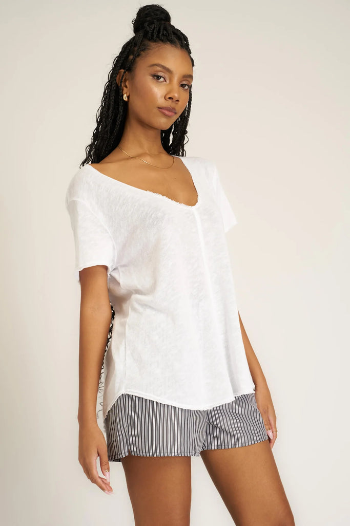 Relaxed fit, wide v-neck, center seam details and raw edging throughout; our Wearever Tee goes wherever you go. Do you see what I did there?