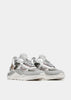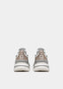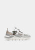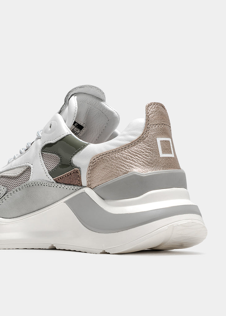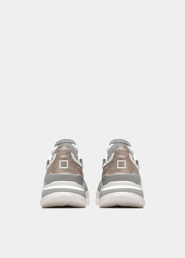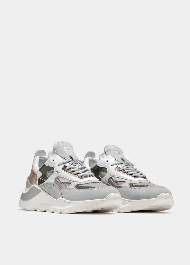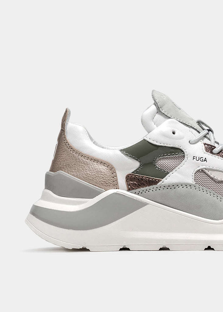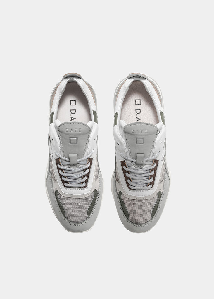 Running sneakers in gray tech fabric with sage green nubuck leather and white leather inserts. Patent green leather and bronze-tone laminated leather details. Sage green nubuck leather patch with logo and DATE lettering seamed at tongue. Embossed FUGA lettering at side. Round laces and etched square logo on a platinum color laminated leather back patch. Leather and cotton terry lining. The 2.5 cm-high raised gel insole allows for optimal comfort. 2-5 cm high sole in Blowtech rubber. All materials used are Made in Italy.