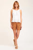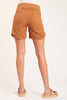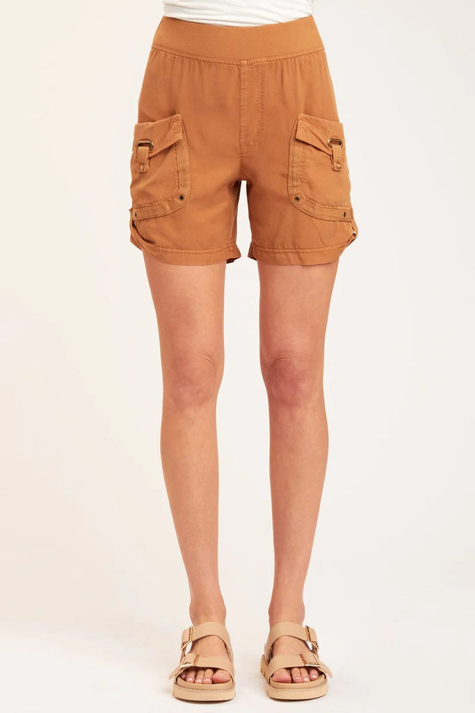 Fun ring snaps and brass details accentuate Klyde's best features. A pull-on elastic waist with tabbed sides and back pockets round out this high waisted short's details.