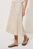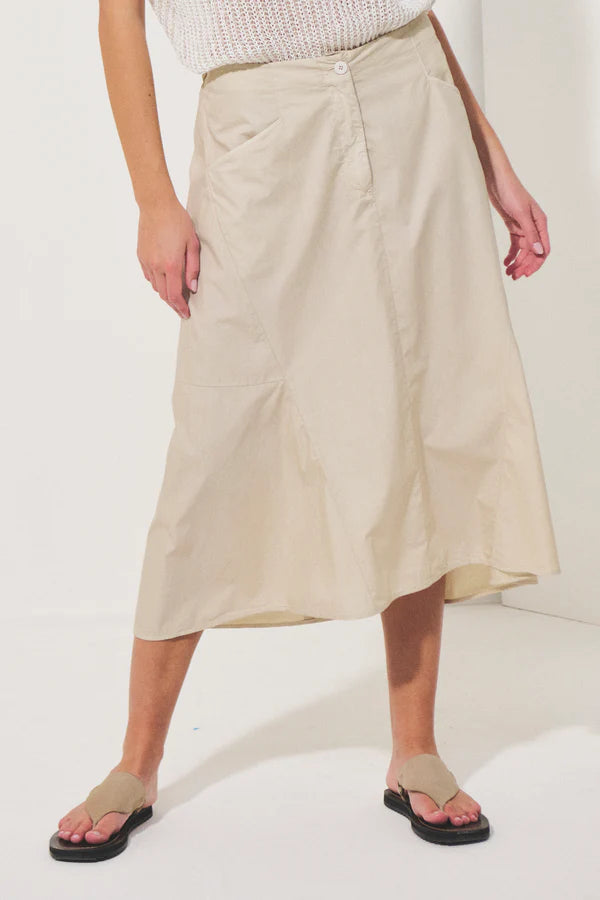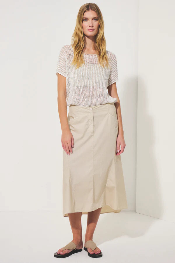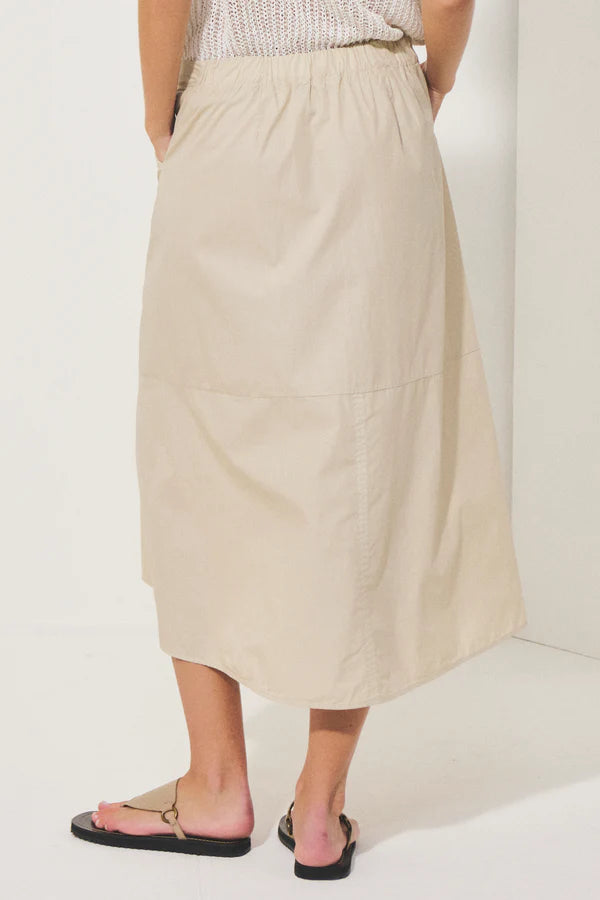 Cotton poplin skirt, with a center front opening with zip and button, flared with a cut motif, slash pockets, longer in the back. Elastic waistband on the back. Garment dyed.