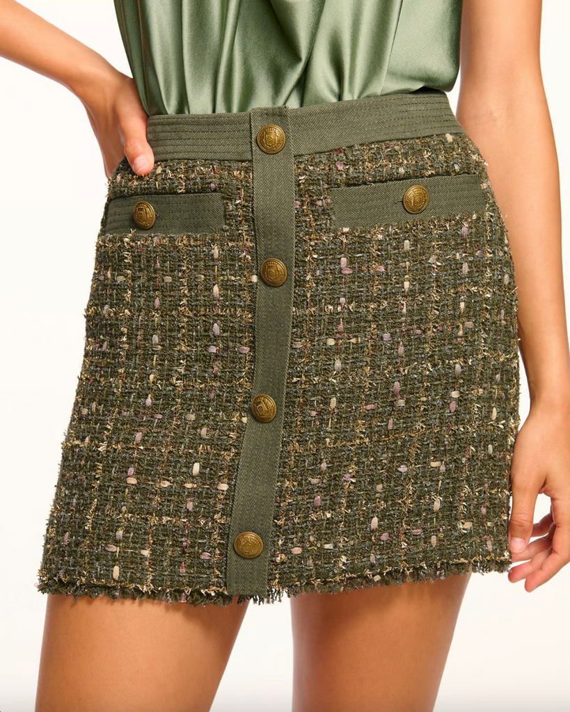 A classic tweed mini skirt is a fall must-have. With statement buttons and a flirty silhouette, the Denver pairs perfectly with a silky top or cozy sweater