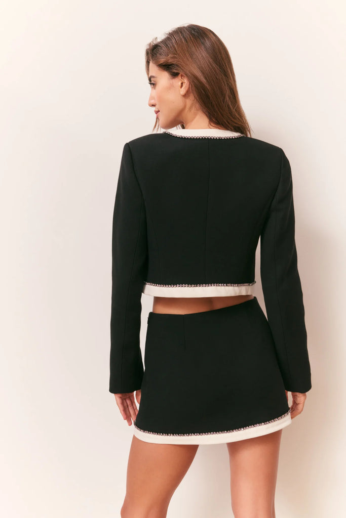 The Edeness Skirt is a modern, polished take on classic tailoring, designed from smooth opulent twill to match the Ralphette Jacket. This structured mini features sparkling rhinestone trim along the sweep and contrasting bows at the hips for a subtle, feminine touch. Perfect as part of a coordinated set or worn on its own, the Edeness Skirt balances refined tailoring with whimsical details for a signature LoveShackFancy look.