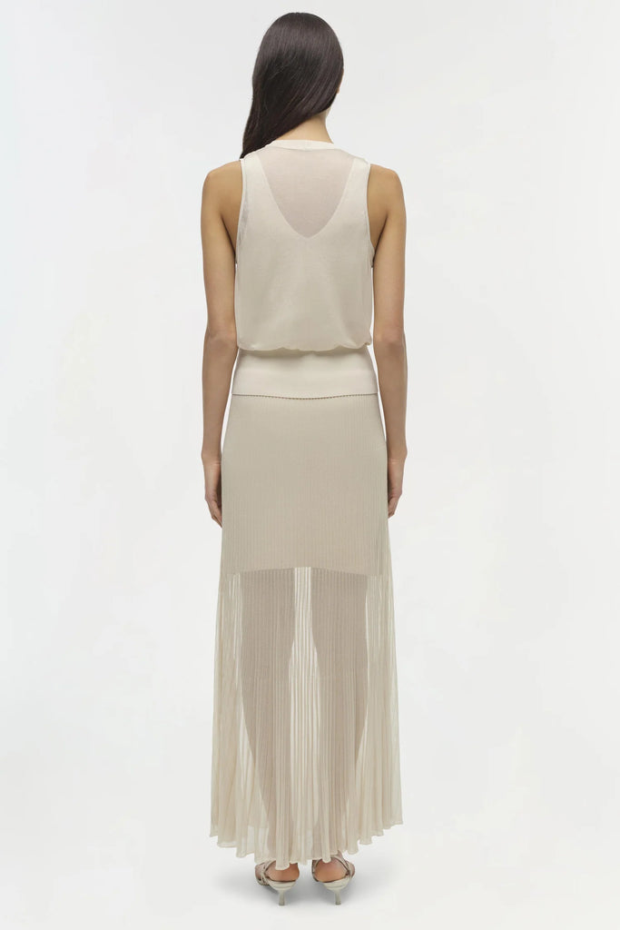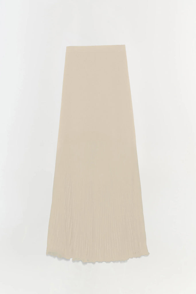 The Gennie Knit Midi Skirt in Sand. Crafted from sheer combo knitwear, this maxi features layered textures and a flowing silhouette.
