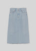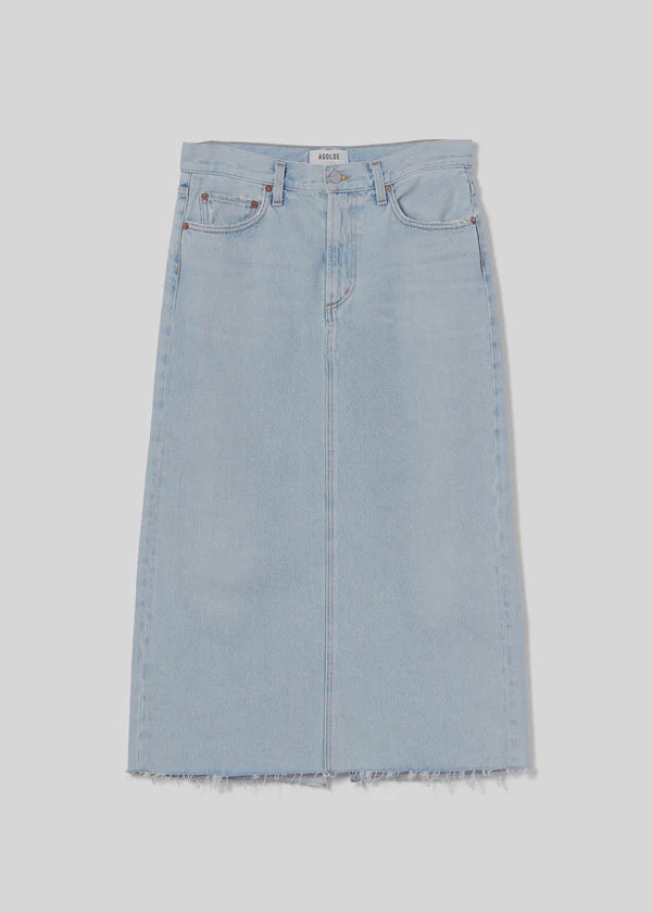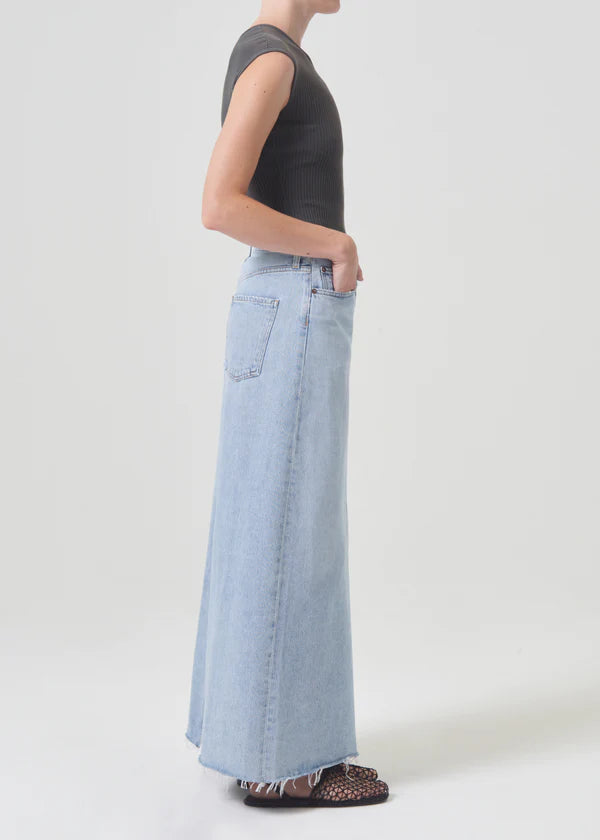 Looks Like: Washed down light indigo, ankle length with a back slit and a raw hem
