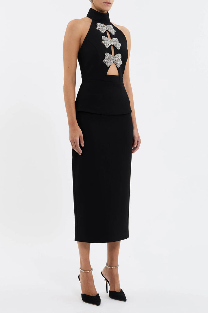 The Lita Skirt in black exudes timeless sophistication, tailored from bonded crepe. Designed in a chic pencil midi silhouette, it elegantly contours the figure for a flattering fit. A back zip fastening ensures ease of wear and a secure fit, while the back split adds a stylish touch. Versatile and refined, this skirt is a must-have addition to your wardrobe.