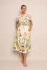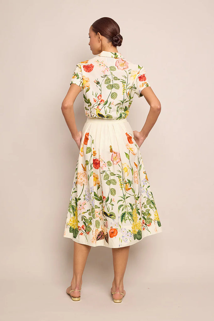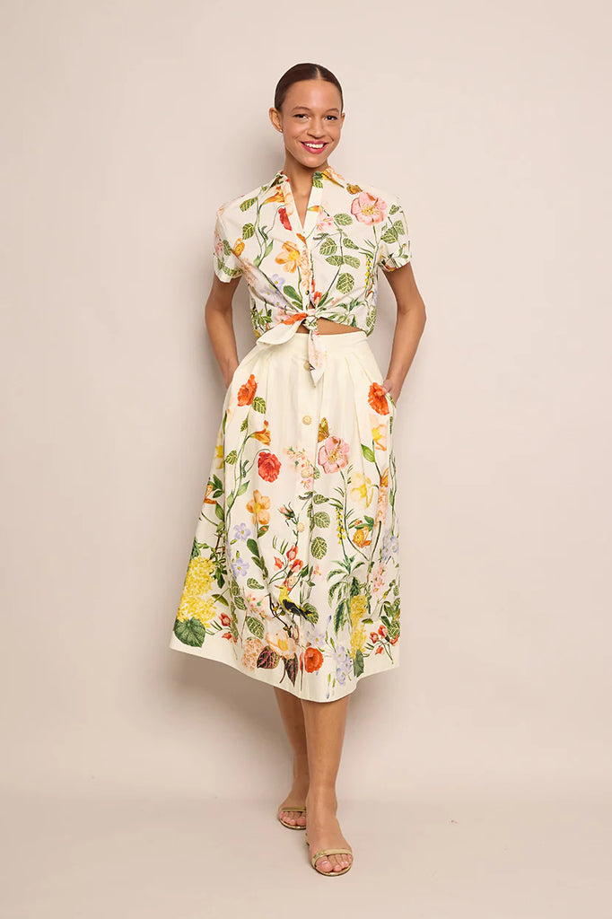 High-waisted skirt with buttons up front. Side slit pockets. Handmade novelty buttons. Pleat and tuck detail. Print placed.