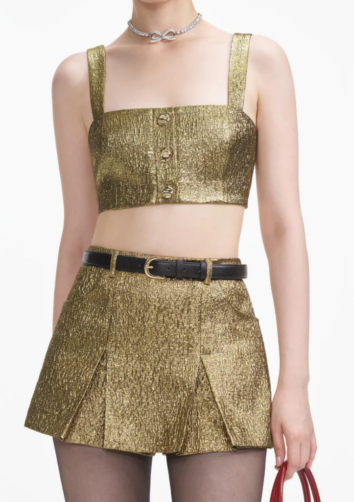 Luxuriously opulent in gold jacquard, this skort's pleated accents and leg-lengthening hem make it an effortless party piece for the holiday season. Add the matching jacket for extra style points.