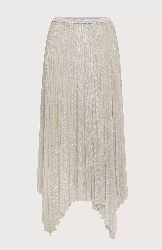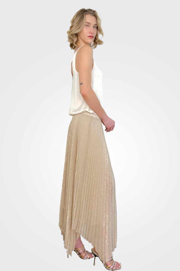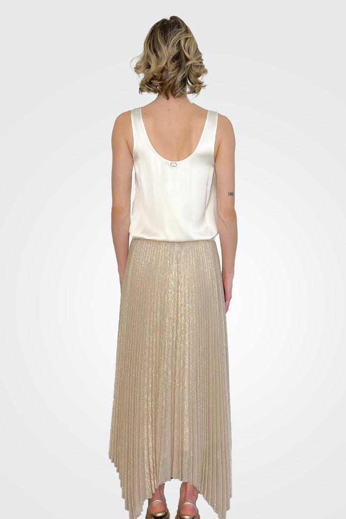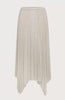 Pleated pencil skirt with asymmetrical bottom of crinkle-effect lurex jersey. Elastic waistband covered with fabric and matching petticoat.