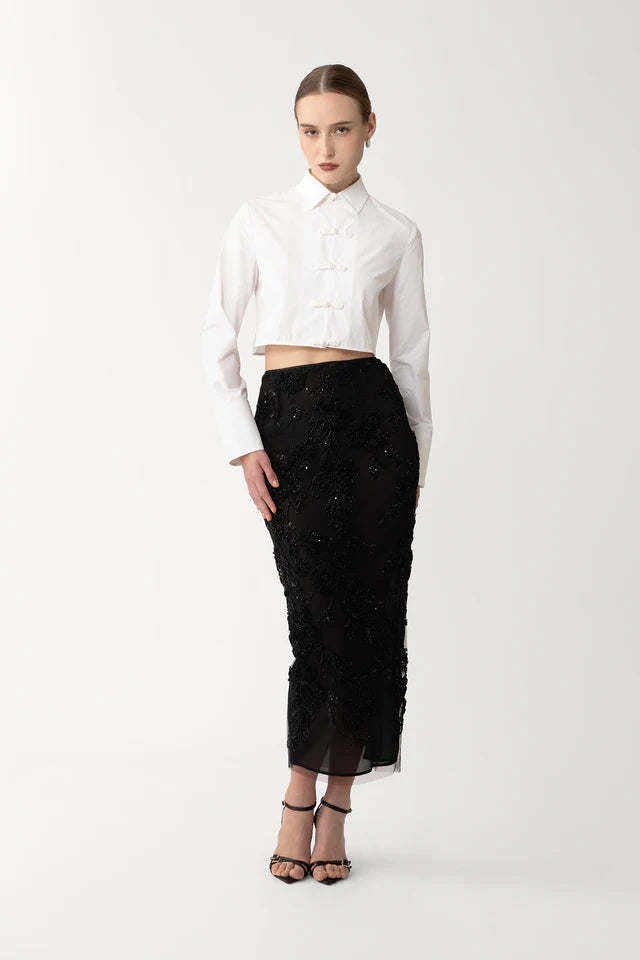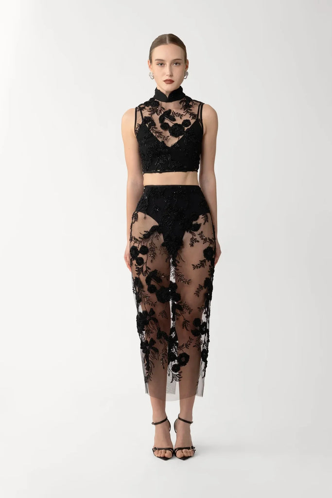 The Skye Skirt is a mesh midi-length embellished with floral sequin beading. Includes a separate slip.