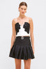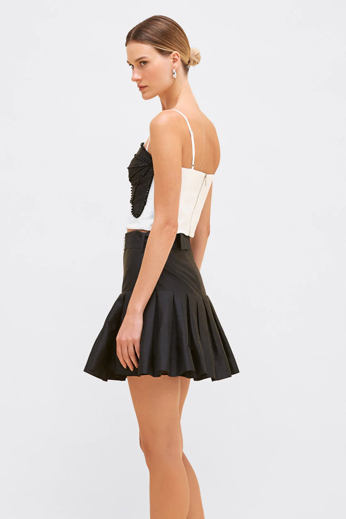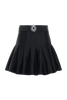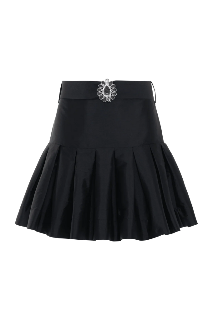 Crafted from structured black taffeta, this mini skirt features sharp knife pleats that create volume and movement. The high-waisted silhouette is enhanced by a statement crystal brooch at the waistband, adding a glamorous accent to the classic cut. A modern piece with timeless appeal.