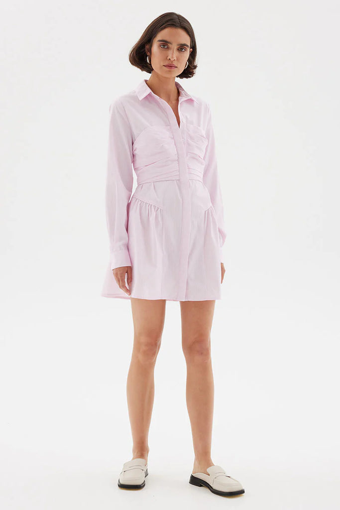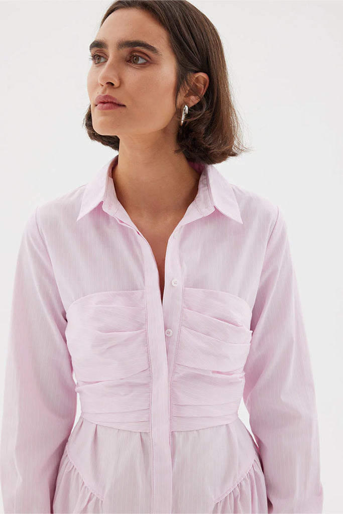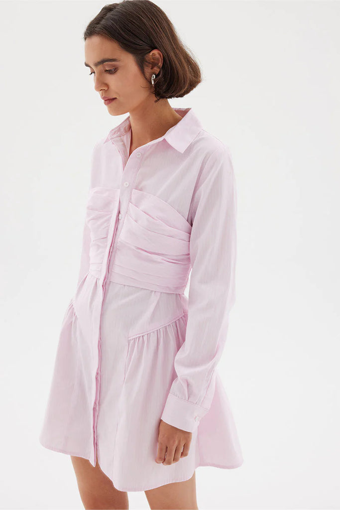 The Evermore Corset Shirt Dress features a long sleeve mini length shirt dress silhouette. Designed with a flattering floating bodice, and a regular comfortable fit.