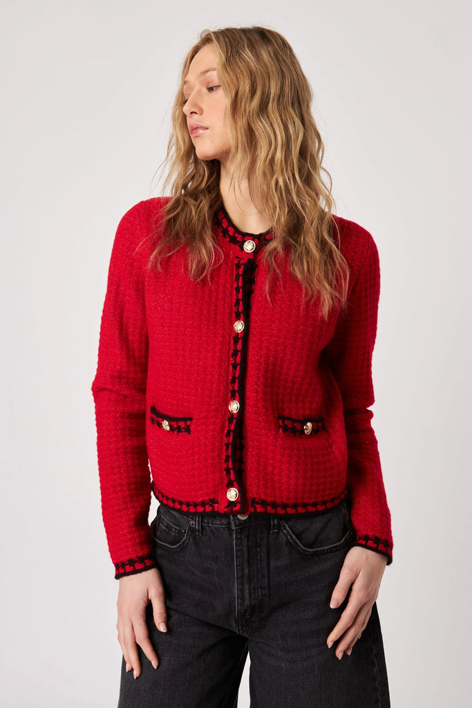 This chic sweater features a stylish contrast of cream and black, exuding both classic sophistication and modern flair. Its luxurious gold buttons and elegant design, crafted from a wool blend, offer warmth, comfort, and refinement. Perfect for any occasion, this standout piece adds a touch of chic to your wardrobe with its high-quality details. Whether for formal or casual settings, this effortlessly elegant and versatile jacket will elevate your style.